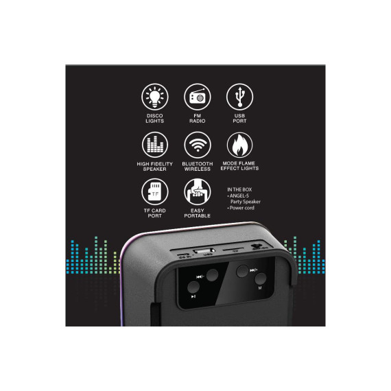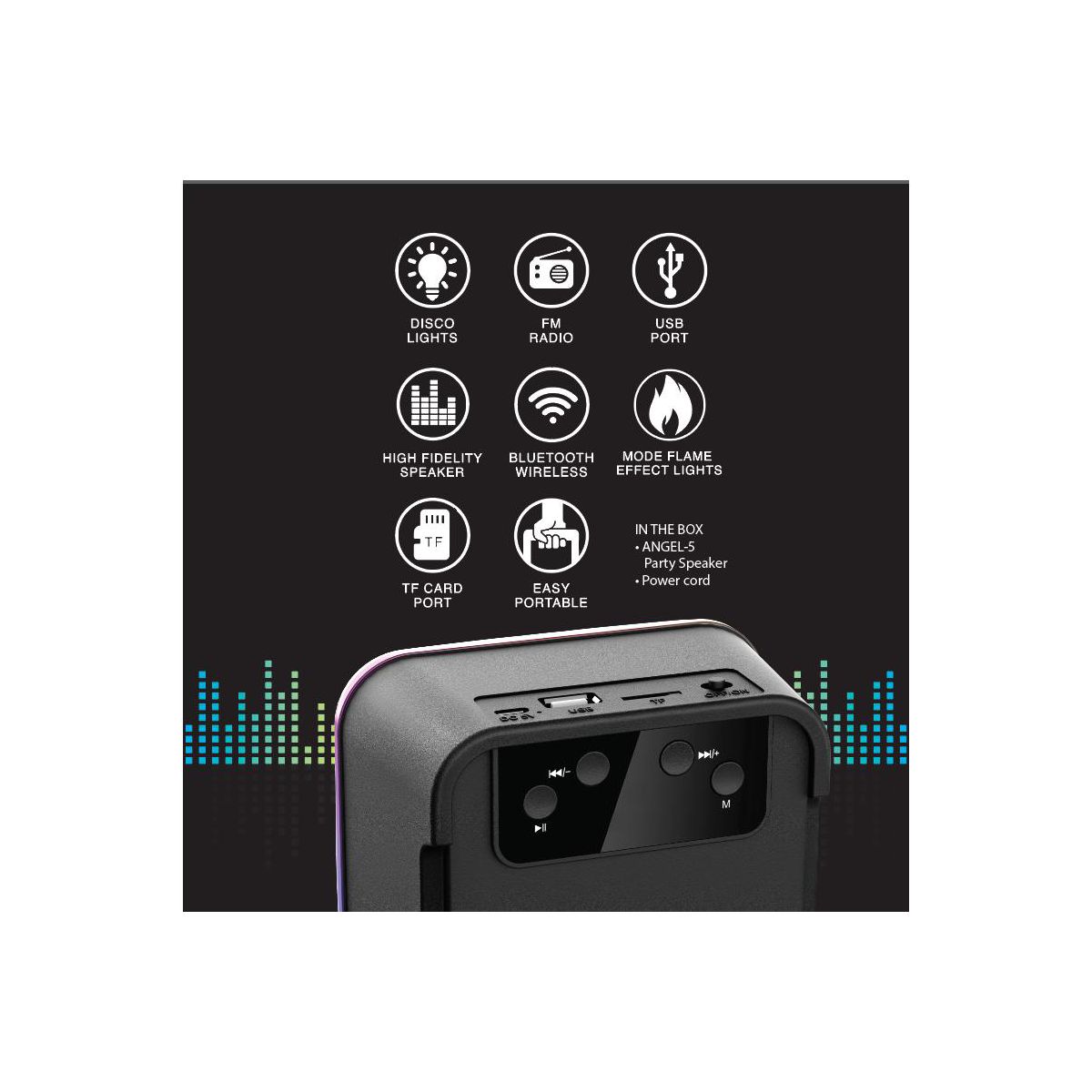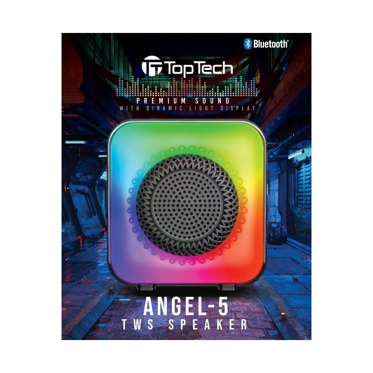 The TOPTECH Angel-5 is a compact yet powerful 4-inch Bluetooth speaker designed to deliver 360° HD stereo sound. With vivid flame effect disco lights and a long-lasting rechargeable battery, this speaker is perfect for both indoor and outdoor events. Enjoy up to 6 hours of continuous music, and easily connect to your devices via Bluetooth, USB, or TF card. With FM radio support and portable design, the Angel-5 is an ideal choice for parties, gatherings, or casual listening at home or on the go.