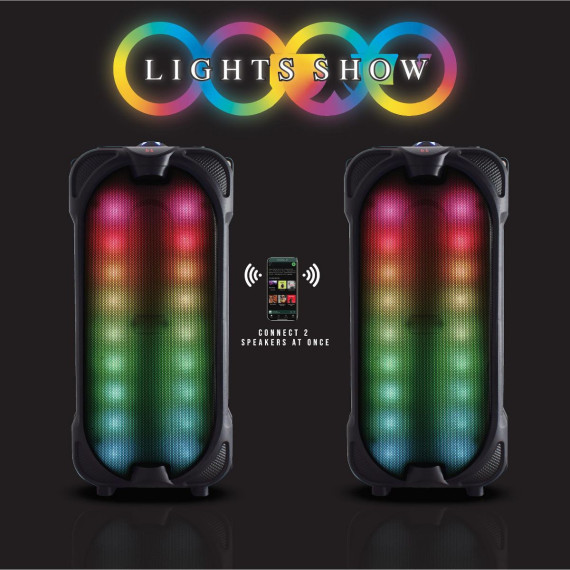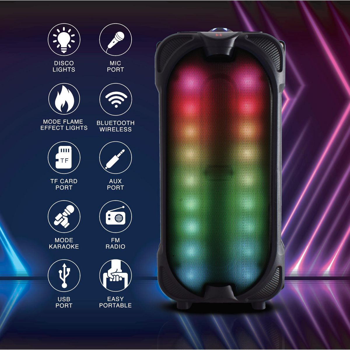 Unleash the power of music with the TOPTECH JET-44 Portable Bluetooth Speaker. Featuring dual 6-inch woofers with powerful music power, this speaker delivers crystal-clear stereo sound and vivid flame-effect lights for a captivating audio-visual experience. Whether you're using it indoors or outdoors, the JET-44 offers a wireless Bluetooth range of up to 33 feet and supports multiple playback options, including USB, TF card, AUX, and FM radio. With its portable design and long-lasting rechargeable battery, it's perfect for any party or gathering.