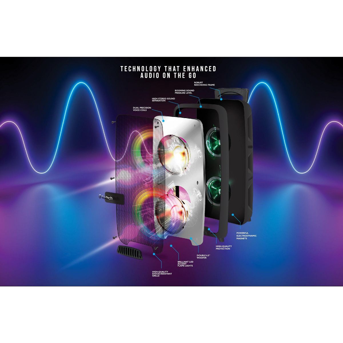 The TOPTECH KL-60 is your ultimate party companion, featuring blazing powerful sound with 2x6.5'' woofers and multi-color disco lights that add energy to your gatherings. With an impressive music power and extra bass functionality, this portable speaker is perfect for indoor and outdoor use. It includes a wireless microphone, FM radio, and multiple playback options, ensuring hours of non-stop entertainment. Whether you're hosting a party, camping, or enjoying a day out, the KL-60 is designed for maximum convenience with handle and wheels for easy portability.