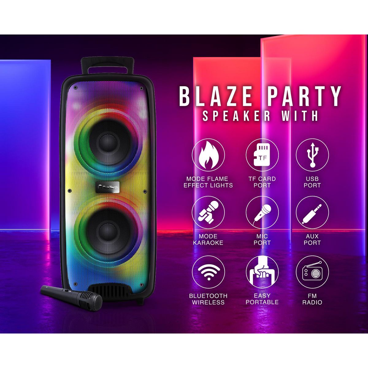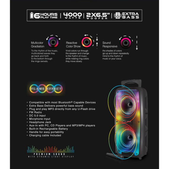 The speaker features vibrant flame effect lights that enhance the atmosphere with stunning visuals. These dynamic lights pulse and shift in color to the beat of your music, transforming your party into a dance floor with energetic, colorful displays that everyone will enjoy.