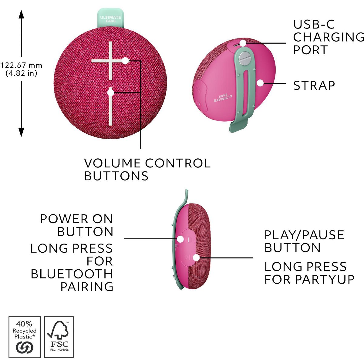 Ultimate Ears MINIROLL Ultra-Portable Waterproof Bluetooth Speaker, Big Bass, IP67 Dustproof, 984-002033, Calming Pink