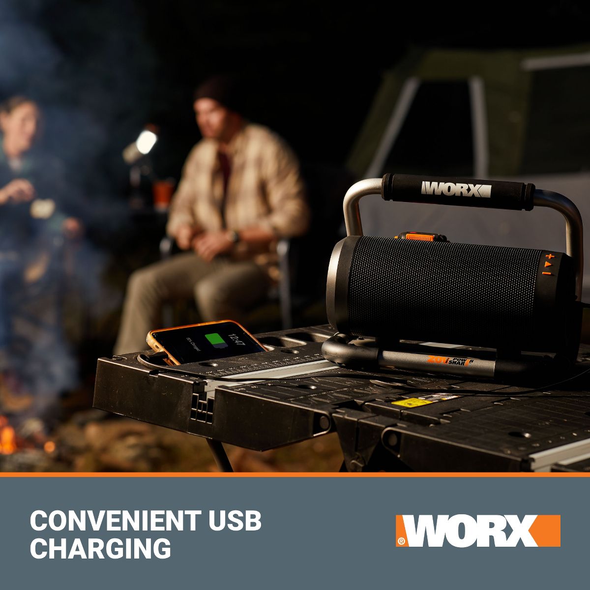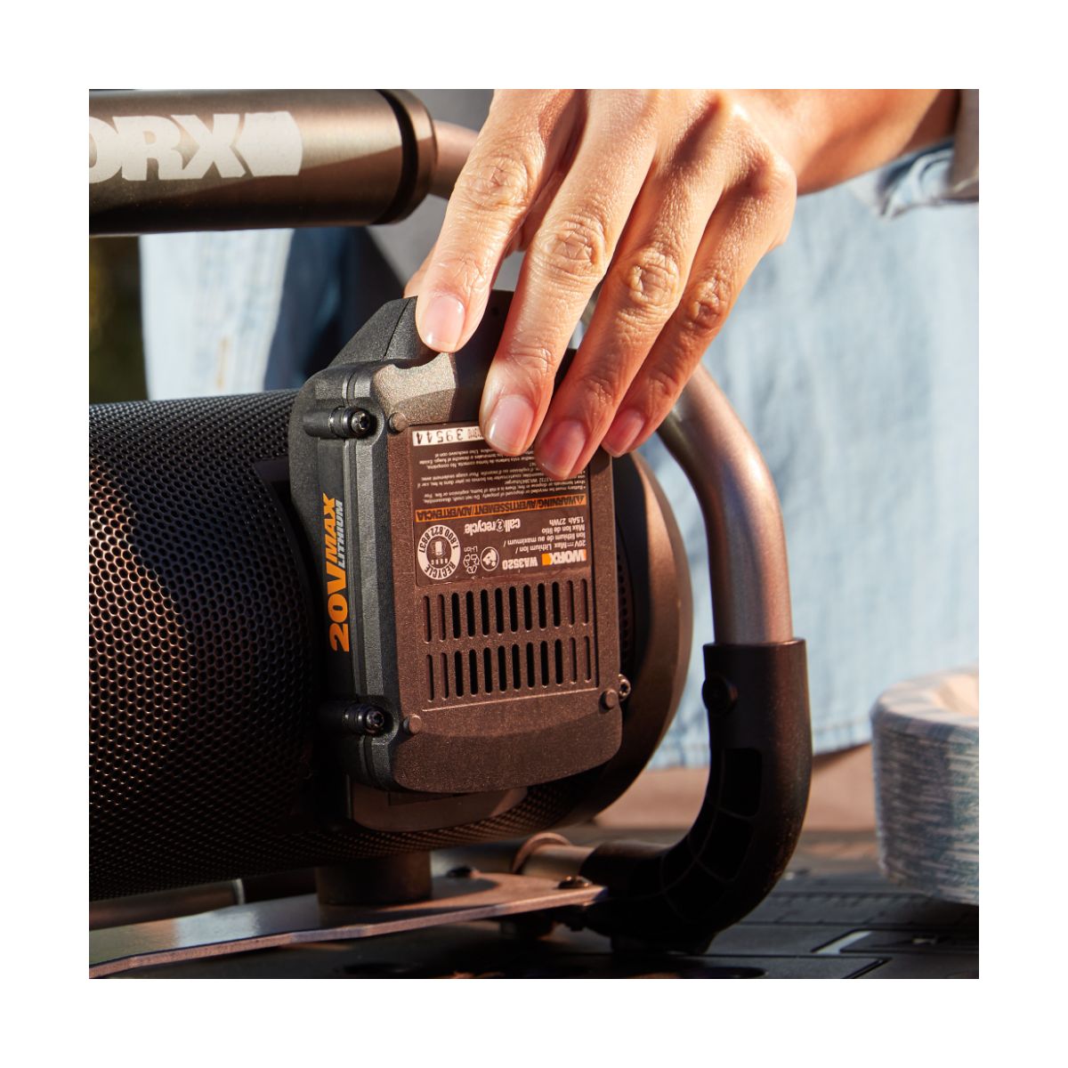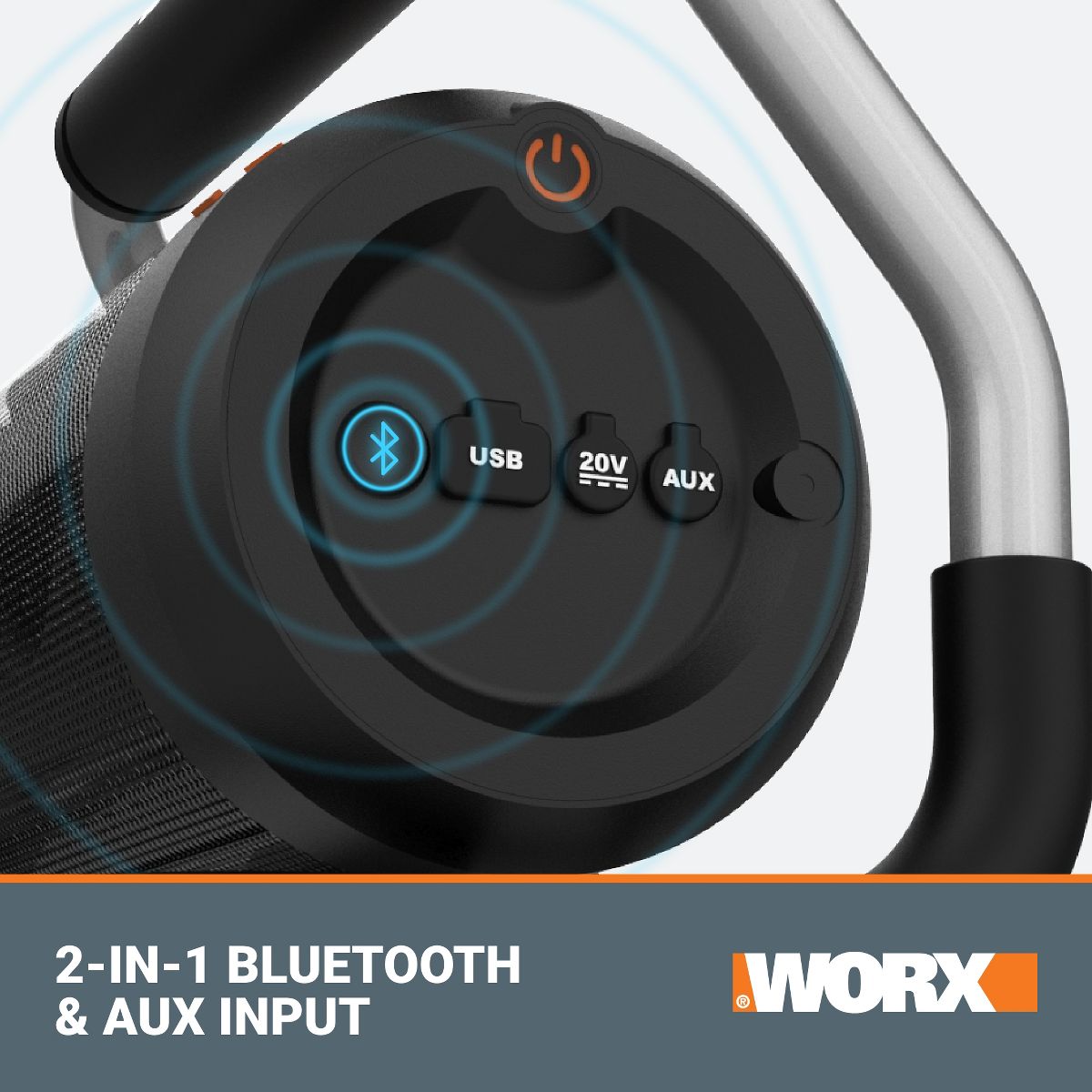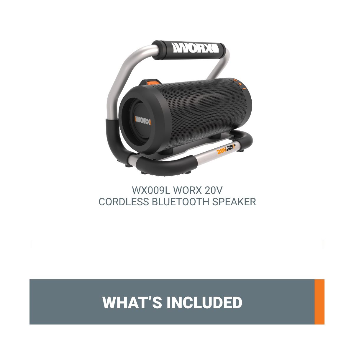 The WORX 20V Power Share® Cordless Bluetooth Speaker is the ideal solution for bringing sound to your space. Whether you're at work, in the garage, at a job site, hosting a party, or taking a beach trip, this fully portable Bluetooth speaker is ready to level up your listening experience. Built with a powerful loudspeaker, the device can produce up to 90 dB for smooth, clear audio. And thanks to Power Share® battery, it can deliver up to 10 hours of listening (with the 2Ah 20V battery) without ever having to be plugged in - a truly convenient way to take music on the move. It's also equipped with a padded roll cage that protects the speaker from unexpected bumps and serves as an easy-carry handle. The cage features a flat base to support the speaker on any flat surface. Using Bluetooth capability, the speaker can connect with any mobile device at a range of up to 32 feet. You can also enjoy added flexibility with the aux input that connects directly with any device using an aux cable. A convenient USB charging port also makes it easy to keep smartphones and other small devices fully charged while you play music. Operating the speaker is a breeze - just use the intuitive buttons to control the power, Bluetooth connectivity, and volume. No fuss. All sound.