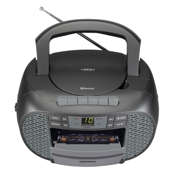 The CD-550ABT Portable Bluetooth® Stereo Compact Disc Cassette Recorder with AM/FM Radio from JENSEN® lets you take along your favorite tunes with a feature-rich music system that includes a CD player, cassette recorder, AM/FM stereo radio, and Bluetooth® connectivity. This unit features a top-loading CD player with green LED track display, which is compatible with both CD-R and CD-RW compact discs, so it provides versatile playback options for store-bought or custom-made CDs. This portable stereo music system has a built-in handle, which is smooth and comfortable for easy transport. Enjoy making recordings with a simple 1-touch function or use the built-in antenna to get clear AM/FM radio for listening or recording. A stereo headphone jack and aux input jack for connecting your iPod®, MP3, or other digital audio players provide even more functionality. This device uses standard 120-volt/60-Hz power or can operate on 6 C batteries (sold separately).