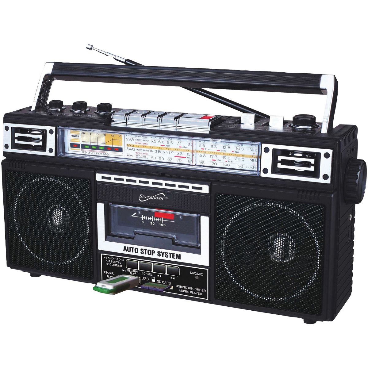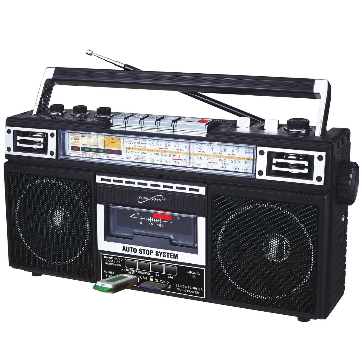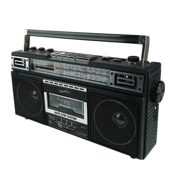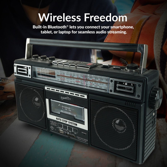 Elevate your music experience with the Supersonic® AM/FM/SW World-Band Receiver Boom Box, striking the ideal balance between nostalgia and modern functionality. This boom box appeals to kids and adults alike, thanks to its cassette player for a trip down memory lane and its compatibility with USB, SD™ Cards, and Bluetooth® for contemporary music streaming. Whether you're grooving to your favorite 80s hits or exploring the latest tracks, this boom box offers a 360° antenna for crystal clear radio reception and a 3-band EQ mode for a tailored audio experience. The boom box also offers the ability to convert cherished analog music into digital files, making it a breeze to relive your favorite tunes from cassette tapes on your own USB or SD™ Cards. With both a built-in speaker and a 3.5-mm stereo earphone jack, you can enjoy music your way, while its versatile power options, from AC to DC, make it suitable for any setting. Embrace the best of both worlds with this boom box that harmoniously blends old-school charm with cutting-edge technology.