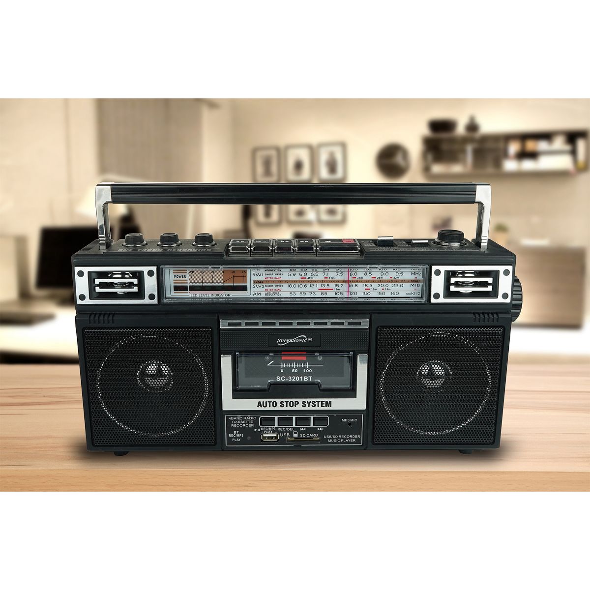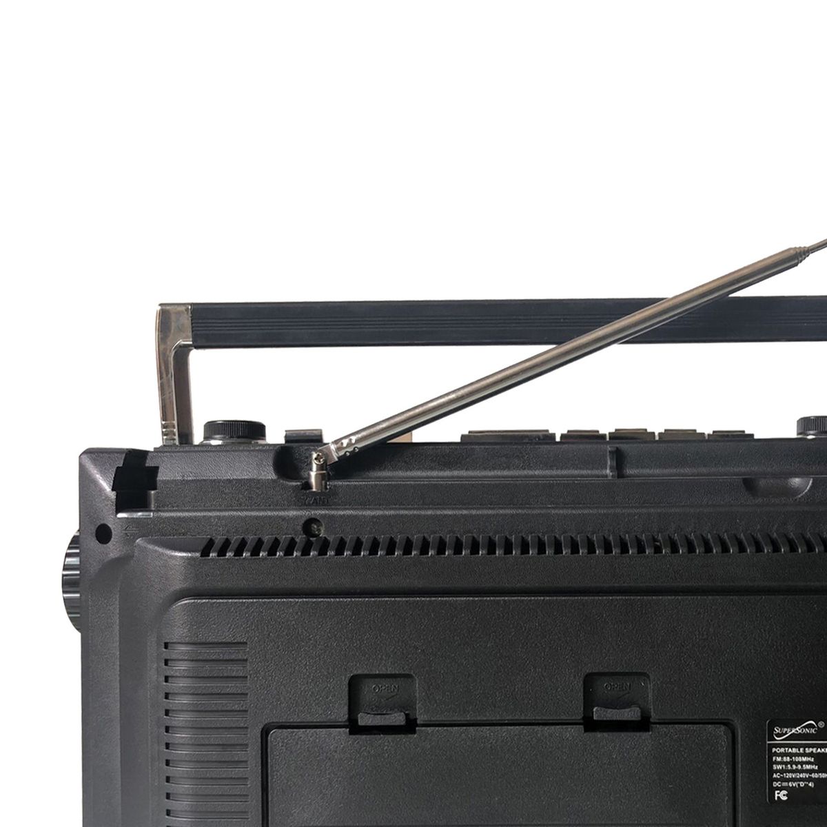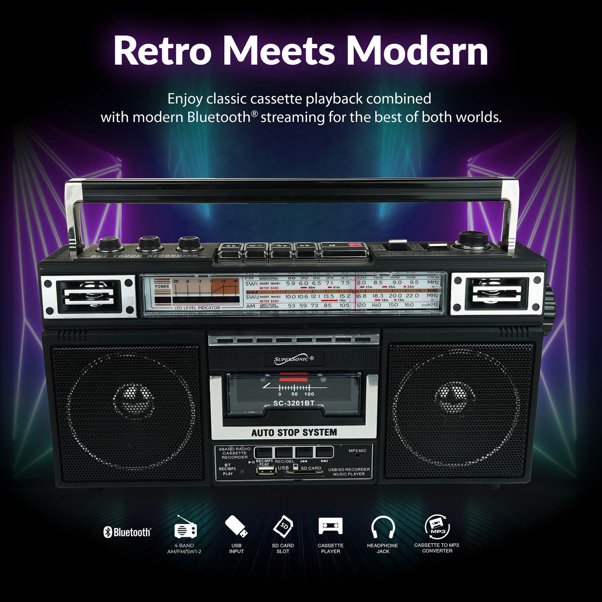 Elevate your music experience with the Supersonic® AM/FM/SW World-Band Receiver Boom Box, striking the ideal balance between nostalgia and modern functionality. This boom box appeals to kids and adults alike, thanks to its cassette player for a trip down memory lane and its compatibility with USB, SD™ Cards, and Bluetooth® for contemporary music streaming. Whether you're grooving to your favorite 80s hits or exploring the latest tracks, this boom box offers a 360° antenna for crystal clear radio reception and a 3-band EQ mode for a tailored audio experience. The boom box also offers the ability to convert cherished analog music into digital files, making it a breeze to relive your favorite tunes from cassette tapes on your own USB or SD™ Cards. With both a built-in speaker and a 3.5-mm stereo earphone jack, you can enjoy music your way, while its versatile power options, from AC to DC, make it suitable for any setting. Embrace the best of both worlds with this boom box that harmoniously blends old-school charm with cutting-edge technology.