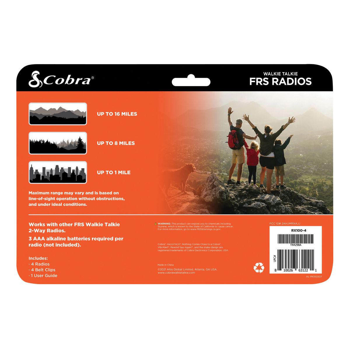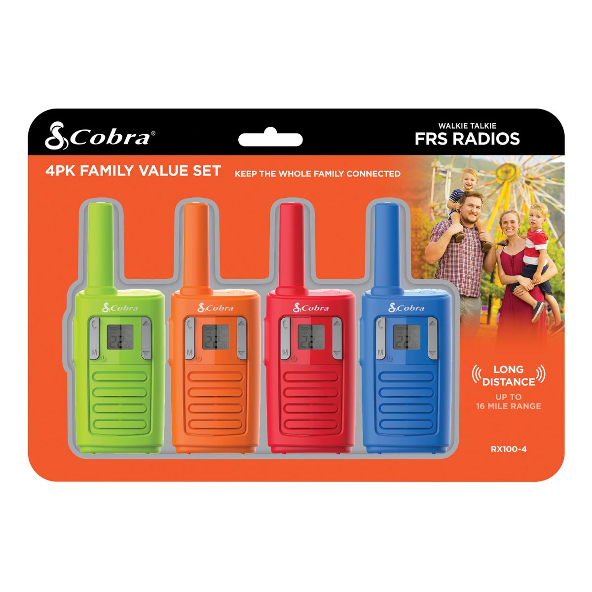 Join the Cobra® Nation and experience the power of reliable communication with the Cobra® RX100 4-Pack Walkie Talkie set. Designed for families and friends to use outdoors, these handheld 2-way radios offer an impressive range up to 16 miles and easy access to 22 FRS (Family Radio Service) channels. Whether on a camping trip, hiking trail, or just your neighborhood, these Cobra® walkie talkies provide clear, dependable communication you can trust. Be ready for any weather with NOAA® weather alerts offering real-time updates to keep you informed and safe. The user-friendly design ensures effortless operation for all ages, making them ideal for kids and adults alike. Automatic Channel Scan, Call Alerts, and the Roger Beep Tone feature add convenience and clarity to every conversation. Compact and lightweight, each Cobra® RX100 handheld radio is powered by 3 AAA batteries (not included), making them easy to carry and travel-friendly. Durable, intuitive, and packed with features, the RX100 walkie talkie 4-pack is your family’s ultimate communication companion for any adventure. Choose Cobra® for reliable performance and peace of mind.