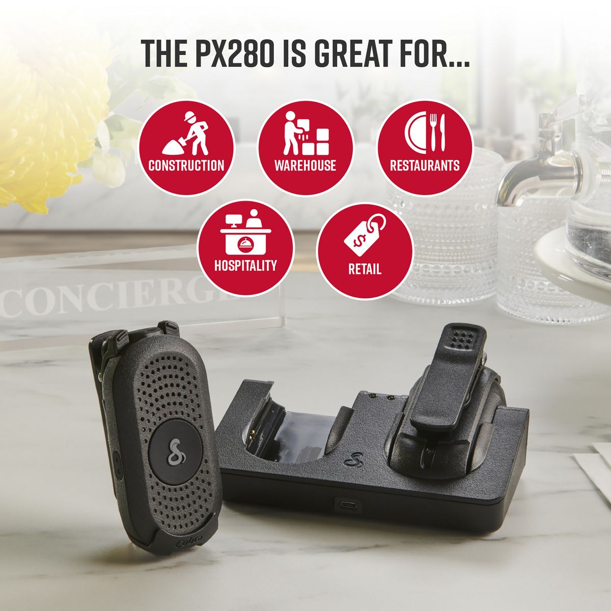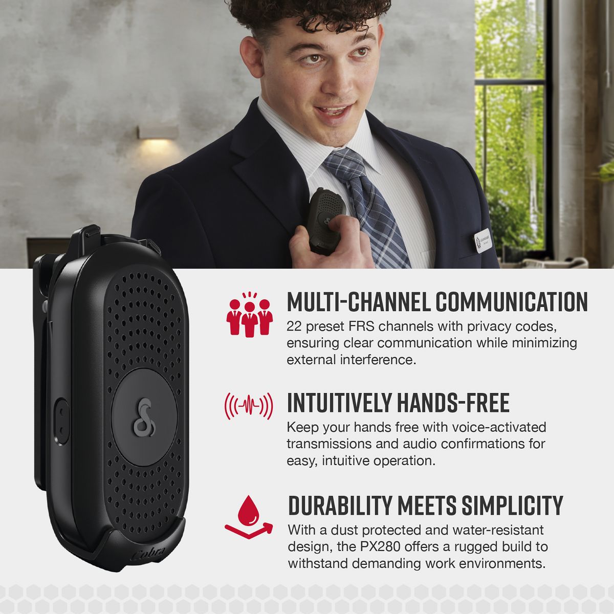 Ready to work right out of the box, the Cobra® PX280 is a compact and simple 2-way radio designed to meet the demanding needs of your workforce. Enhance your team connectivity with 22 broadcast channels featuring 38 different privacy codes, minimizing crosstalk and interference. Its VOX transmission option and voice prompts provide a hands-free experience, helping you and your team stay focused on your customers.