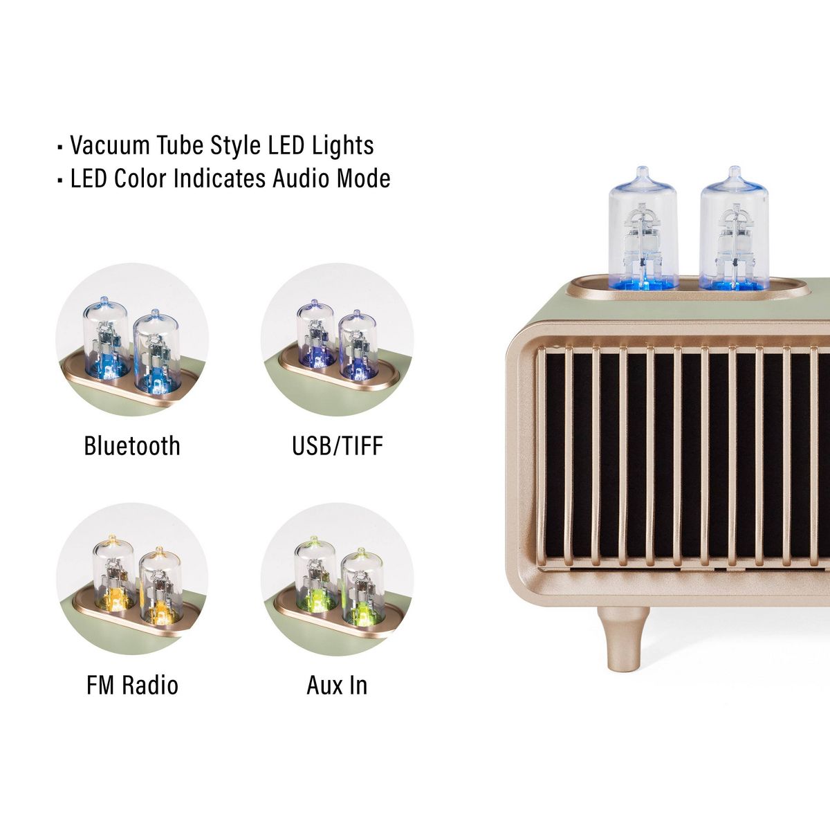 The Milton Radio transports you back in time with its vintage appearance, but there's more to it than good looks. Cycle between FM radio, aux input, USB playback, or Bluetooth. Whatever you choose, the vacuum tube style LEDs change color to indicate your mode. Add this portable radio to your nightstand or countertop for a taste of the past with modern-day function.