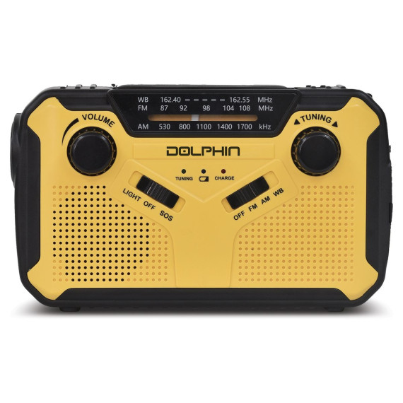 The Yellow DSP Emergency Radio from Dolphin Audio is a must-have for any home or travel use thanks to its built-in AM, FM, and weather band tuner. This emergency radio features 4-way power options to keep you up to date with the latest news and alerts. The built-in rechargeable battery offers hours of use. And if you need more power, simply use the hand crank or solar panel options! There is also a backup battery compartment for 3 AAA batteries (batteries not included) to keep the radio going. Need to charge your smartphone? No problem, because it can also act as a power bank. Simply connect your device to the emergency radio to charge! There's also a built-in flashlight and reading light. This is the ideal addition to any camping trip or RV.