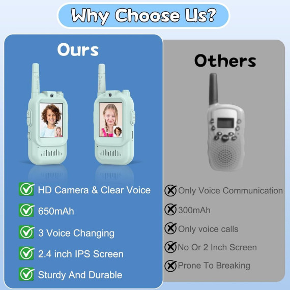 Fun features like video communication turn quick check-ins into part of the game, whether kids are exploring indoors or outdoors. This set is a video walkie talkies option for everyday play, helping kids coordinate games and share quick moments with friends and family. The listing mentions gift or birthday ideas, so it can be a gift-ready pick for gifting. The listing highlights features that keep play moving while staying easy to understand. Video and audio communication can make pretend adventures feel more real. For distance, the listing notes long-range transmission , which can vary by environment. Use it for camping, hiking, outdoor play when kids want to stay connected and coordinate turns. For repeat use, rechargeable power can be convenient, and push-to-talk style controls help kids start chatting quickly. Follow the provided instructions, keep devices dry, and handle with care during active games. Refer to listing details for exact specs. Quick Notes: - Setup & Use: Charge and set channels or modes as the listing instructs, then practice short messages so kids learn timing. - Safety & Notes: Use with supervision for younger children and keep devices away from water. Follow the included guidance for best results. - Storage & Space: Store units and any listed accessories together so everything is ready for the next play session. - Performance/Use Case: Long range is described and can change with walls and obstacles. Choose spaces that fit the list