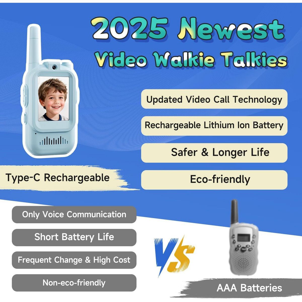 On playdays at home or outside, video walkie talkies can help kids stay connected while they explore together. This set is a video walkie talkies option for everyday play, helping kids coordinate games and share quick moments with friends and family. The listing highlights features that keep play moving while staying easy to understand. Video and audio communication can make pretend adventures feel more real. For distance, the listing notes long-range transmission with figures like 100m, 400m , which can vary by environment. Use it for camping, outdoor play, indoor play, neighborhood when kids want to stay connected and coordinate turns. For repeat use, rechargeable power can be convenient, and push-to-talk style controls help kids start chatting quickly. Follow the provided instructions, keep devices dry, and handle with care during active games. Refer to listing details for exact specs. Quick Notes: - Setup & Use: Charge and set channels or modes as the listing instructs, then practice short messages so kids learn timing. - Safety & Notes: Use with supervision for younger children and keep devices away from water. Follow the included guidance for best results. - Storage & Space: Store units and any listed accessories together so everything is ready for the next play session. - Performance/Use Case: Long range is described and can change with walls and obstacles. Choose spaces that fit the listed conditions.