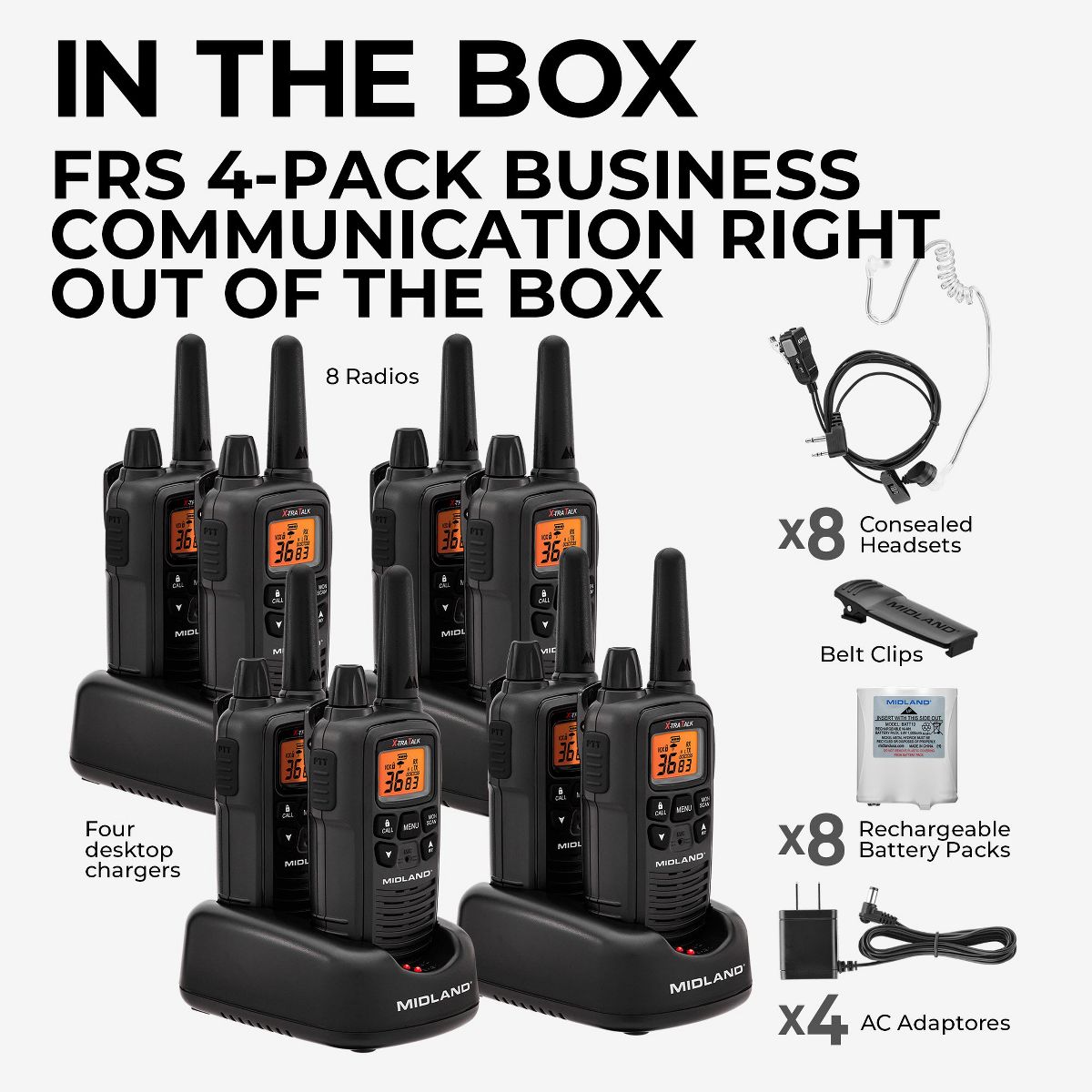 The LXT600BBX4 Business Radio Bundle is an affordable way to get your entire team in communication with the push of a button. The LXT600 FRS radios are license-free and require no permit to own or operate, saving your business time and money. While compact in size, these radios provide plenty of power for clear transmission and reception for small to medium sized business spaces including restaurants, retail stores, boutiques, small warehouses and offices. The LXT600BB comes complete with 8 radios, 8 rechargeable battery packs, 4 dual-slot desktop chargers, and 8 concealed headsets for unobtrusive communication. The radios feature 36 channels, silent operation, eVox for hands free operation, and NOAA Weather Alert technology. Make sure your team always has access to clear, consistent communication with the LXT600BB Business Radio Bundle.
