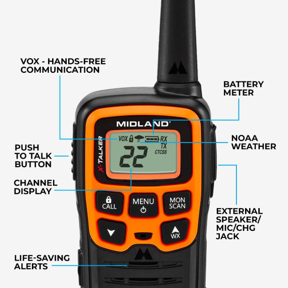 The X-Talker® T51VP3 FRS Two-Way Radio offers you the ability to communicate license free and features Xtreme range, 22 channels, 38 privacy codes, channel scan, and our legendary Weather Alert technology. NOAA Weather Alert will sound an alarm indicating that there is a risk of severe weather in your area. With clear reception, clear transmission, and clear sound quality you will have confidence that your communication needs will be supported.