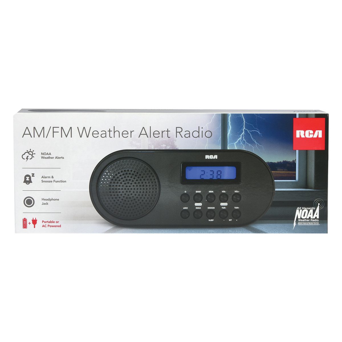 Stay updated on all the important weather events with RCA's AM/FM Weather Alert Radio. You'll get an alert each time a severe weather event is issued via NOAA weather updates, including tornadoes, hurricanes, heavy rain/flooding, and earthquakes. The alerts are automatic, giving you the seconds you need to seek shelter. This device doubles as your digital alarm clock with snooze function, plus AM/FM radio, and a built-in headphone jack. It is battery powered for protection against power outages, plus reliable portability. It is also AC power compatible for continuous use. Never miss a major weather event, thanks to RCA.