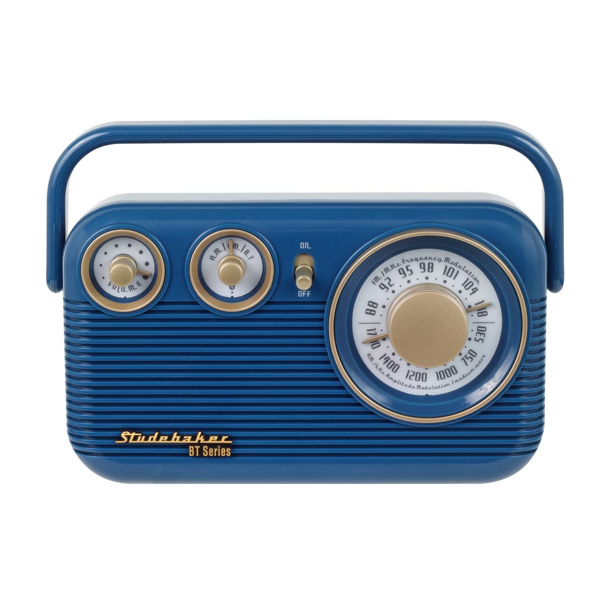 The Studebaker SB2003BT AM/FM radio is a retro portable radio with classic styling, and easy to use features. The large analog tuning knob simplifies adjusting to your favorite stations, along with AM/FM and volume knob controls as the speaker delivers excellent sound with clear and static-free audio. Play music from other devices like your tablet, iPod®, MP3 player or other digital audio players through the built-in auxiliary input jack, connect your devices with Bluetooth compatibility or even listen in peace, connecting your favorite pair of headphones using the built-in 3.5mm headphone jack. The compact, durable design features a carrying handle and telescopic antenna. It operates on 120V AC or on 4 x "C" batteries (not included),and makes the radio perfect for taking with you anywhere you go.