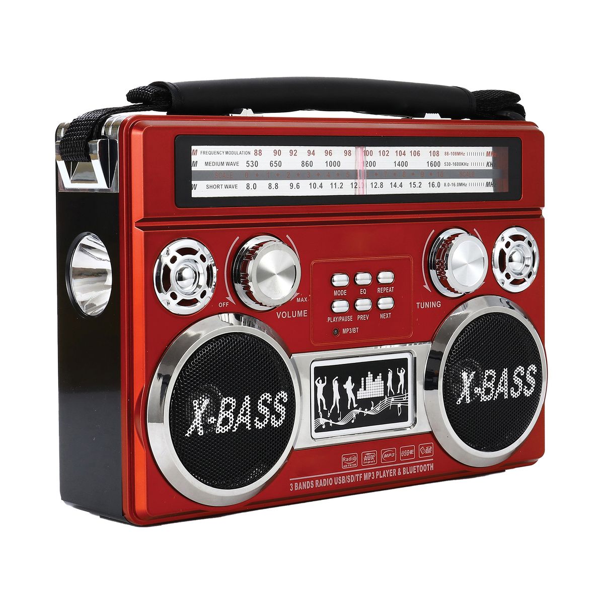 Take your tunes on the go! The Red Supersonic Portable 3-Band Radio with Bluetooth and Flashlight has a retro look. Its receiver can pick up AM and FM radio stations as well as shortwave radio bands. Built-in Bluetooth allows you to connect to your smartphone, tablet, laptop, computer, and more. This portable radio can also play MP3 files from USB drives and microSD Cards plus it has a 3.5-mm aux input so you can playback audio from non-Bluetooth devices. Additionally, there's a flashlight on the side and a handle so you can carry the AM/FM shortwave radio anytime day or night. This vintage-styled Bluetooth radio operates on AC power, but can also run on batteries, which are sold separately. Battery life is up to 10 hours for the flashlight and 2 hours for the radio.