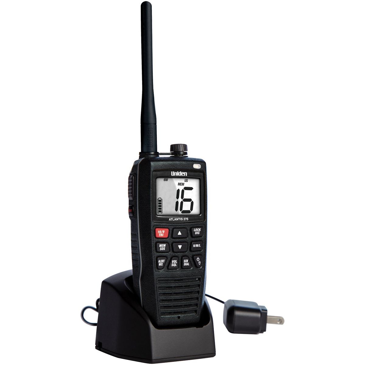 The Uniden Atlantis 275 Floating Handheld 2-Way VHF Marine Radio features all NOAA emergency weather channels, as well as all USA, International, and Canadian marine channels. It also meets IPX8 submersible waterproof standards and provides big-ocean power in a compact day-at-the-lake size. The Atlantis 275 brilliant, backlit LCD display makes it easy to use, day or night, for the power to go anywhere. And because you never know when a nice day on deck might turn into a quick dunk in the water, it's been designed to be a radio that’s comfortable with both scenarios. The Atlantis 275 is equipped with 6 watts of power to be your lifeline to information and communication that keeps you safe at sea. Built to throw in your pocket or tuck away on deck, this floating VHF marine radio is easily within reach throughout it all.