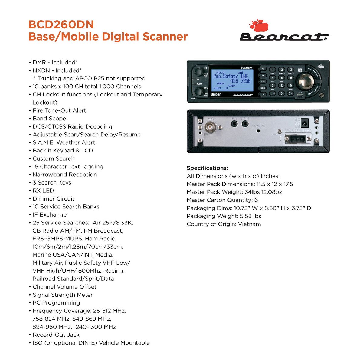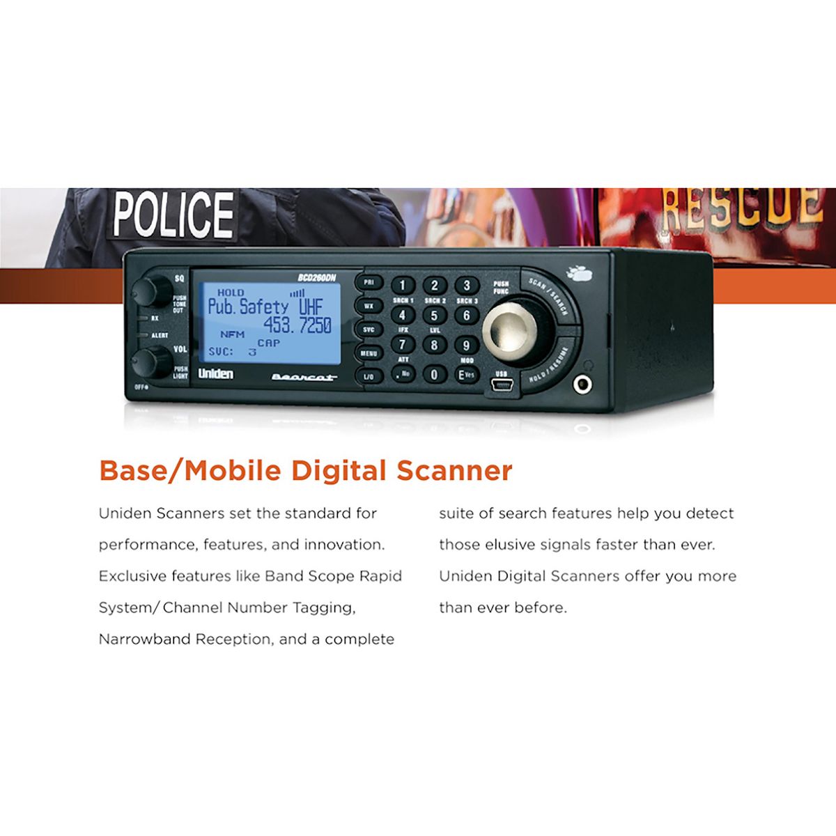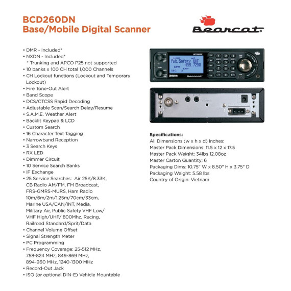 The Uniden® BCD260DN Scanner sets the standard for performance, features, and innovation. Exclusive features like Band Scope Rapid System/Channel Number Tagging, Narrowband Reception, and a complete suite of search features help you detect those elusive signals faster than ever. Uniden® Digital Scanners offer you more than ever before. This scanner is pre-programmed with service bands for your convenience. It covers the bands used for emergency reporting including S.A.M.E. weather alerts, aviation, marine, railroad, and non-digital ambulance, police, and fire emergencies. The Uniden® Bearcat® BCD260DN is designed to meet the needs of aviation, railfan, and maritime enthusiasts. It offers the similar features as the Bearcat® BC125AT, but with enhancements in a base/mobile configuration. This scanner is a superb choice for public safety agencies utilizing analog, DMR, and NXDN conventional communication systems (non-trunking systems).