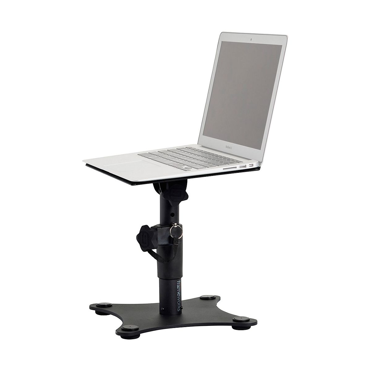 This pair (2) of Gator Frameworks Desktop Studio Monitor Stands features a12"/305mm x 9"/229mm speaker platform with a soft, EVA-lined surface. It fits most small-sized studio monitor speakers, both vertically and horizontally. The multipurpose top deck surface holds MacBook Air and Pro models.