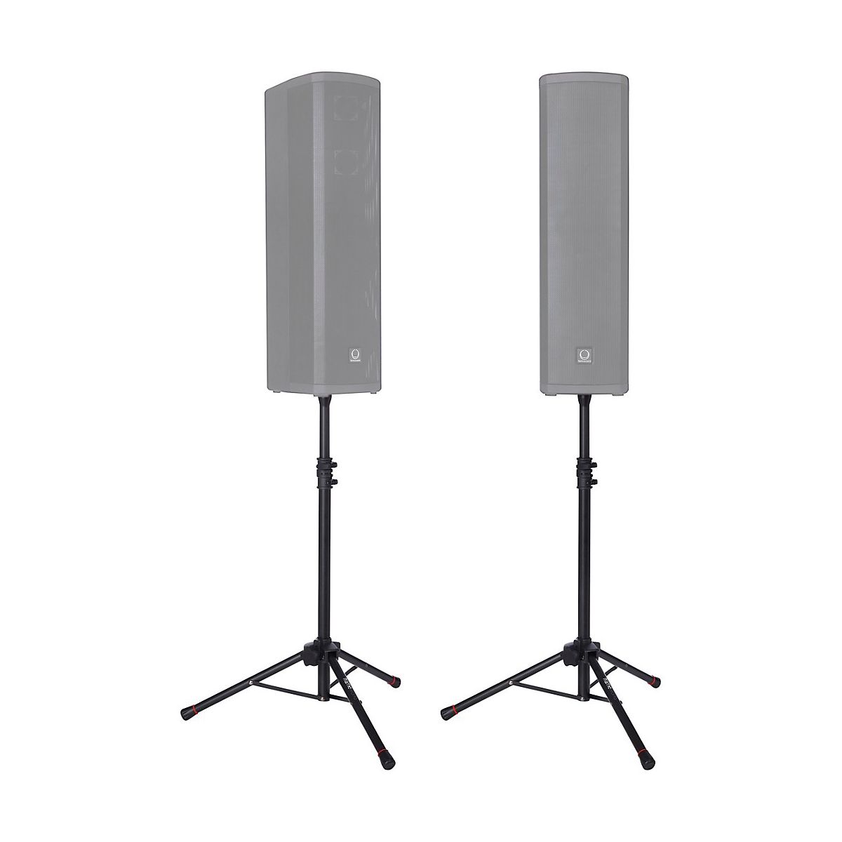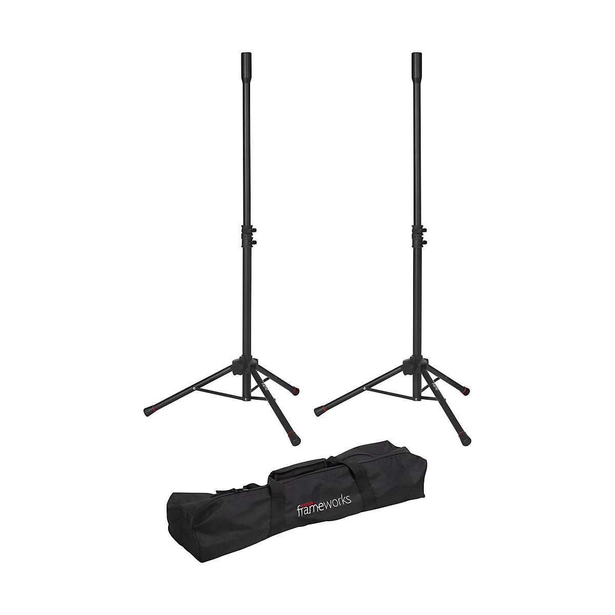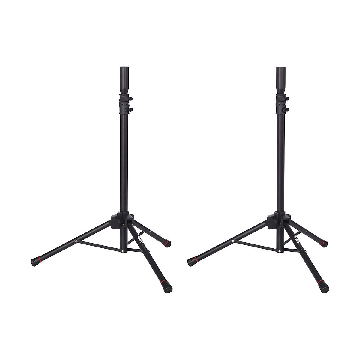 Complete setup with this set of two mini speaker stands. Ideal for smaller stages and venues, each stand can hold up to 60 lbs of equipment. They include an adapter sleeve for 38mm speaker mounts. Plus, it's easy to adjust the height thanks to the soft touch knobs. For safety, each stand has removable red safety rings on the feet to avoid accidents. The stands are lightweight and collapsible, making set up and takedown simple. This set of mini speaker stands includes a carry bag for easy transportation.