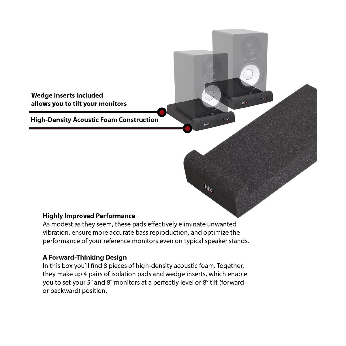 Each set includes 8 pieces of studio speaker foam pads that can be configured in multiple ways. Use them flat for standard setups, or angle them slightly to direct sound when monitors are placed above ear level. Perfect for home studios, professional recording spaces, and mixing rooms, these studio isolation pads provide reliable performance while protecting your investment in speakers. With LyxPro, you get durable speaker pads designed for both small and large setups.
