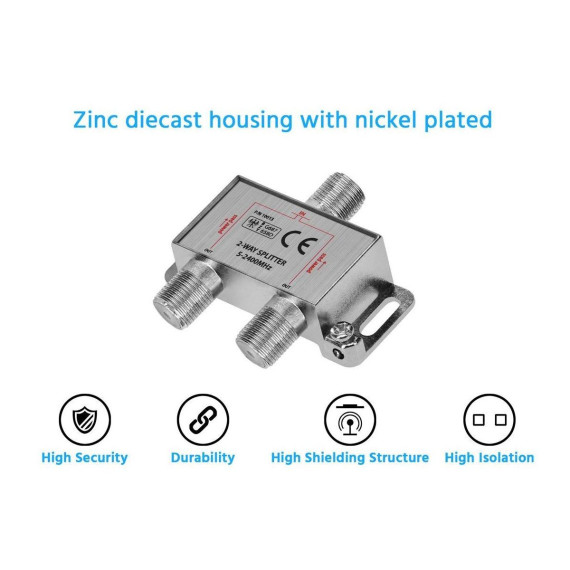 This premium signal splitter divides a single coaxial cable input into multiple separate signals, allowing several devices to receive the same signal simultaneously. It maintains strong signal quality with minimal loss, making it ideal for home use with TVs, DVRs, and other coaxial-connected entertainment devices. Durable and reliable design.