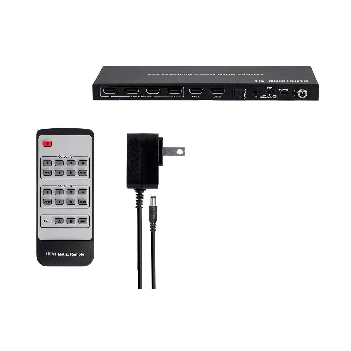Monoprice Blackbird 4K HDMI Matrix, 4x2, HDR, 18G, 4K@60Hz, YCbCr 4:4:4, EDID, Coaxial Audio, Powered Switch, Control Remote