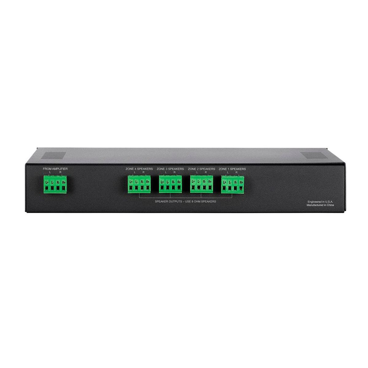 The SS-4 Speaker Selector is a resistor-based, impedance matching speaker selector used for connecting up to four pairs of 4-ohm or 8-ohm speakers, while maintaining a safe impedance load for your amplifier or receiver. Each pair of speakers can be independently turned on or off using push buttons on the front panel, with no need for worrying about amplifier loading.