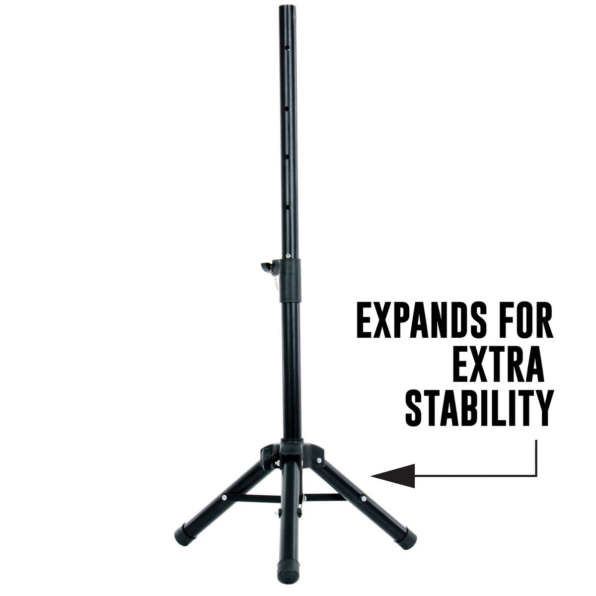 Elevate your sound with this QFX® S-14 Universal Adjustable PA Speaker Tripod Stand. It is a compact tripod speaker stand designed for small- to mid-size speakers with 1.38-in. diameter hole mount and a load capacity up to 60 lbs. It features a collapsible tripod design which makes it easy to transport. It is adjustable from 26 in. to 54 in. in height and includes a support pin for optimal and secure speaker placement.