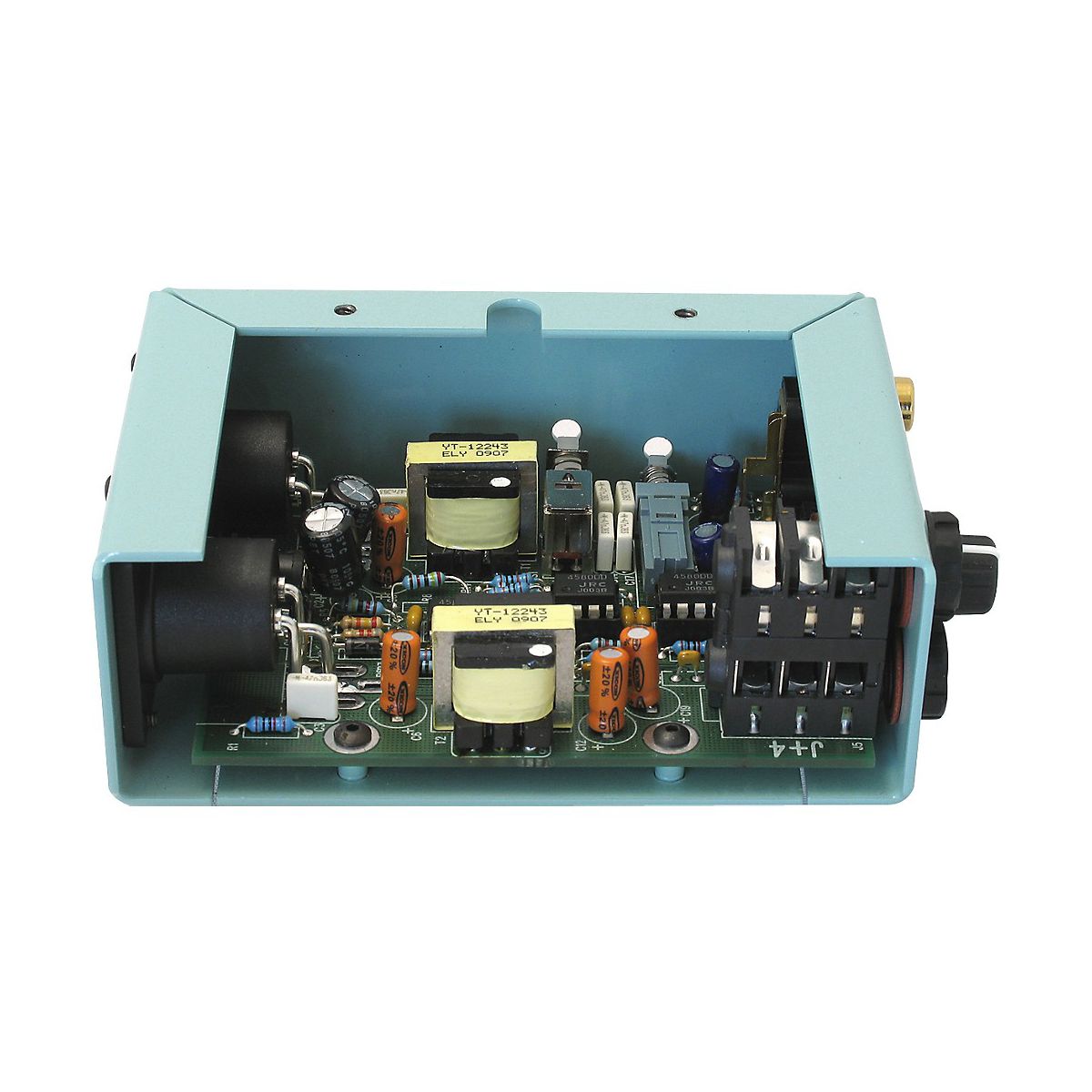 The Radial Engineering J+4 Stereo Line Driver accepts consumer level -10dB unbalanced high impedance signals and converts them to +4dB balanced low impedance signals. If needs involve pro audio, whether in broadcast, recording studios, or live touring, 'll find the Line Driver box invaluable. Radial paid careful attention to noise elimination by combining the advantages of active signal buffering with transformer isolation. The J+4 delivers better than 95dB signal-to-noise. It also keeps hum and buzz caused by ground loops and spurious clocking noise from polluting the signal path. For reliability and ease-of-operation, Radial kept controls on the J+4 to a minimum. Input connectors include a stacked set of 1/4" jacks for DJ mixers or keyboards, RCA's for CD players and a mini 3.5mm for I-pods. High Pass Filter - The Radial stereo J+4 is equipped with a handy high-pass filter that is used to cut low frequencies below 100Hz. This provides several important benefits. First and foremost, when playing back audio tracks through a PA system, excessive bottom end can produce low frequency resonance which in turn can cause runaway feedback. It is also important to note that bass frequencies contain significantly more energy than higher frequencies. Reducing bass content can dramatically increase system's dynamic range. Finally, by reducing unneeded low frequencies, it really helps clean up the mix. Built tough - As with all Radial products, the Radial J+4 is built tough to handle the extreme rigors of professional touring. A unique 14-gauge steel I-beam inner frame ensures the sensitive PC board will not be subjected to outside stress which could potentially cause solder joints to fail. An innovative book-end outer shell creates protective zones around the sensitive controls, switches and connectors to further improve dependability while a full bottom no-slip pad provides both mechanical and electrical isolation. The Radial J+4 balanced line driver delivers exceptional sonic performance, plenty of headroom and ultra-low noise making it the ideal companion in today's more demanding professional audio systems.