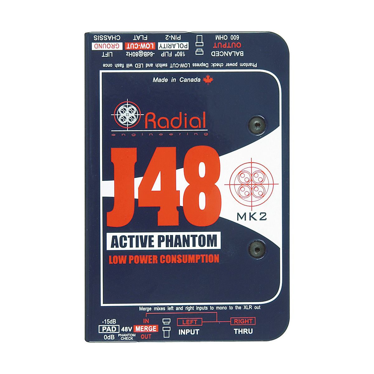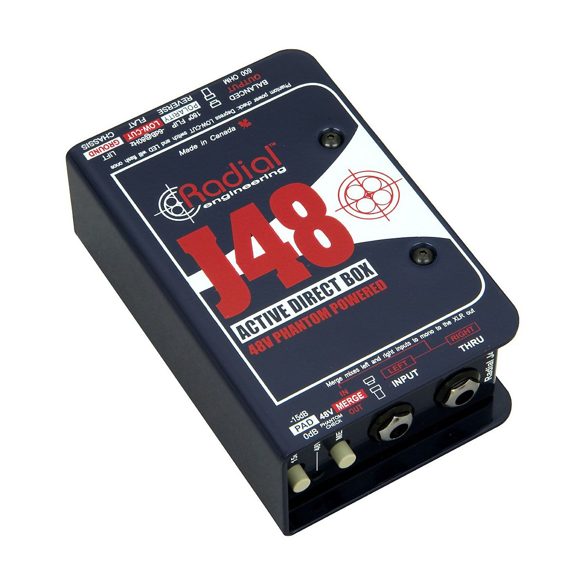 The Radial J48 is a great-sounding active direct box that has been optimized to produce maximum headroom while working within the limited current available from standard 48V phantom power. By employing a unique switching power supply, the J48 is capable of peak transients to 9 volts without choking. The result is lower harmonic distortion, half the intermodulation distortion and significantly improved dynamics over other DIs. Features include a -15dB pad, 180 degree polarity reverse, a unique merge function to mix 2 signals to mono, an 80Hz high-pass rumble filter, and ground lift. Like all Radial products, the J48 is built to handle abuse on the road and features a unique welded I-beam construction for years of trouble-free performance.