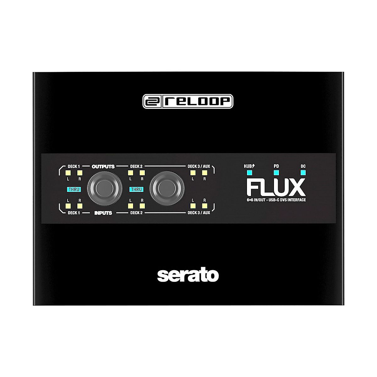 The Reloop Flux is a next-generation USB-C interface for using Serato DJ Pro with turntables, CDJs or other media players. The interface boasts superior audio qualities, a well-designed operating concept and a club-ready design. It can transform any conventional mixer into a professional digital vinyl system.Maximum FlexibilityThree stereo inputs provide DJs with maximum flexibility. Turntables, CDJs and similar can be used in any combination. The settings are adjusted using discreet DIP switches, which virtually eliminates any chance of accidental switching in the club. The interface includes three stereo outputs, including an AUX out that can be routed to Serato DJ Pro’s internal sampler. Gold-plated, corrosion-resistant RCA jacks ensure high-quality audio transmission. Full ControlThe ReloopFluxprovides the best possible routing overview thanks to clearly visible signal flow LEDs for all inputs and outputs and a Thru status indicator. Connection status (hub, PD, DC) LED indicators on the top of the interface provide additional control options. The Direct Thru buttons on the top of the interface enable to quickly and easily activate and disable Thru mode, which allows connected turntables and CDJs to be used conventionally. Navigation through the Serato software is no longer necessary.Hub InsideThe Reloop Flux includes a built-in 2-port USB-A hub for connecting MIDI controllers and other USB accessories. Aside from the expanded connection options, the hub reduces potential connection faults in a busy club environment by keeping the setup connected even without the laptop.Studio Quality — Anytime, AnywhereThe Reloop Flux offers studio quality in the club and wherever it's needed with 24-bit/96 kHz, high-quality digital/analogue converters and ultra-low latency. For this reason, it’s a superior DVS interface that can also be used as an audio interface in the studio.Always PoweredThe Flux is bus-powered by a computer, so there's minimal wiring required for audio and power cables. The DVS interface can also be powered by external power sources through the USB-C DC input, allowing turntables and CDJs to be used in Thru mode even without a computer connected. The Flux's second USB-C port provides Power Delivery support for other USB-C devices (max. 60 W), such as a MacBook.Robust and RoadworthyThe Reloop Flux interface has a durable metal housing with a scratch-resistant, black surface, ensuring a long service life even with heavy use. The extended edge design keeps the connections well-protected.Plug and Play for Serato DJ ProThe Reloop Flux unlocks the full version of Serato DJ Pro and Serato DVS. This means DJs can get up and running with the market-leading digital vinyl system in no time. Additional licenses are not necessary.