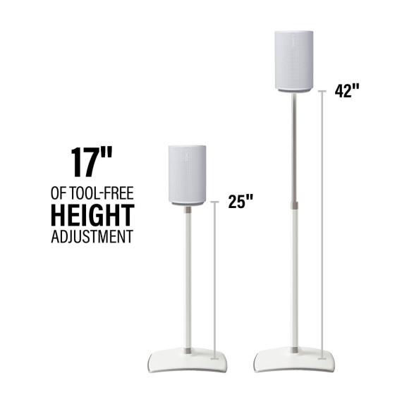 These SANUS Height-Adjustable Speaker Stands designed for Sonos Era 100 offer 17" of effortless sliding height adjustment cable management and a sleek design. These adjustable stands are sure to deliver optimal audio performance regardless of your listening needs. Constructed of durable steel and extruded aluminum this not only resists wear but also perfectly complements the aesthetics of the Sonos Era 100 for a sleek seamless look. Perfect for use in any setup be it home theater surround sound or ambient listening. For a cable-free look Sanus's Press Fit cable management technology secures and conceals cords down the back of the stands. Assemble easily in 15 minutes with a Phillips screwdriver this sleek stand will help get you the perfect sound for your space.