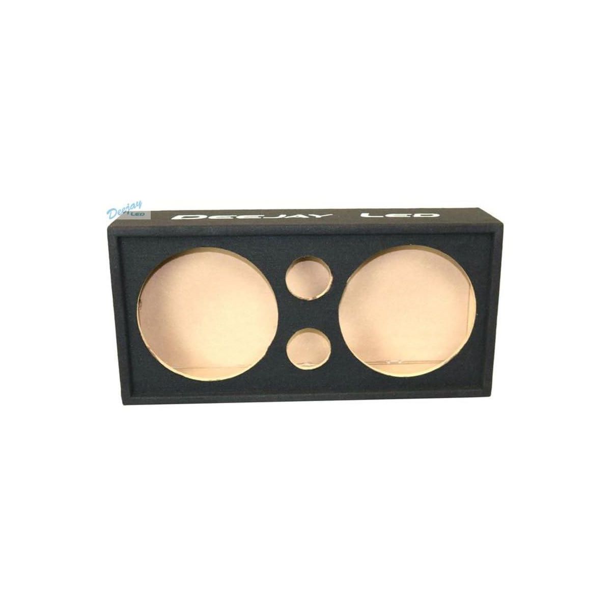 * Empty Speaker Housing for two 10-in Woofers and Two Tweeters * Heavy Duty Carpet Exterior with Quality Embroidered Stitched Logo * 11.13-in Diameter Holes for two 12-in Woofers * Two Pre Cut 3.5-in Diameter Holes for Tweeters * 4-Conductor Quick Release SpeakON Type Receptacle for Wire Connection * 5/8-in MDF * Dimensions:30.25-in x 14.75-in High x 7.25-in Deep * About a 1/2-in Front Edge Lip * Includes the DEEJAY LED model 4 conductor quick release plug socket REQUIRES MODEL TBH4PINMALE NOT INCLUDED