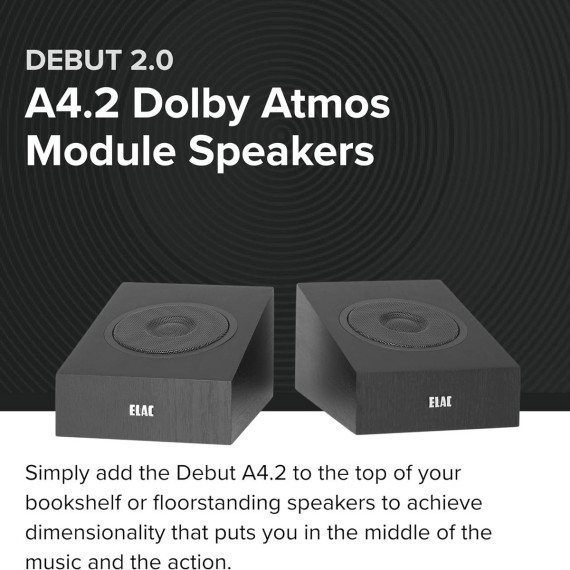 Experience immersive, three-dimensional sound with the Dolby Atmos-enabled AV receivers and processors. This product features Dolby Atmos technology that expands the sonic landscape, creating a true 3-D space that you have to hear to believe. Simply add the debut A4.2 to the top of your bookshelf or floor standing speakers to achieve a dimensionality that puts you right in the middle of the music and the action. The product is equipped with a woven Aramid-Fiber woofer for exceptional sound quality. It also boasts a custom concentric driver and an intricate crossover that work together to deliver clear, balanced audio. Despite its powerful performance, the product has a compact design with a height of 4.92 inches, a width of 7.09 inches, and a depth of 9.21 inches. It is Dolby Atmos Certified, ensuring its ability to provide you with an extraordinary listening experience. Enjoy your music and movies like never before with this cutting-edge technology.