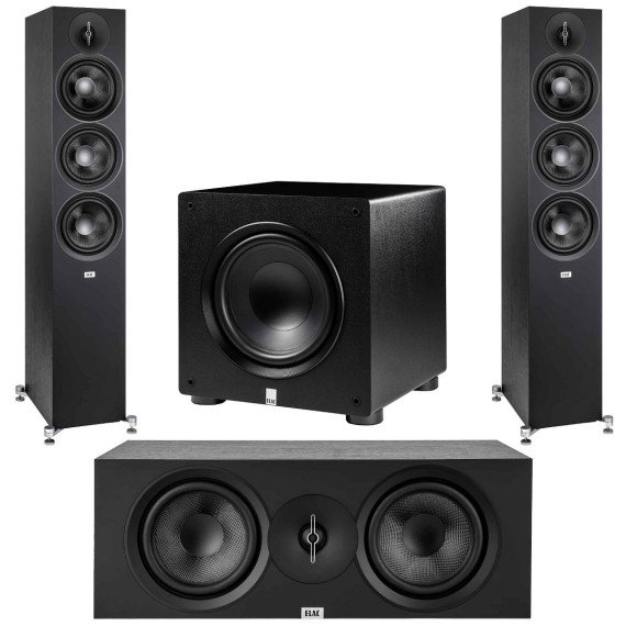 This bundle boasts 2 Elac DF63-BK Debut 3.0 6.5" Floor Speakers - Black, each with advanced custom drivers and a sleek design. The speakers cater to audiophiles, offering clarity and depth for stereo or home theater setups. The bundle also includes 1 Elac DC63-BK Debut 3.0 6.5" Center Speaker, delivering a captivating soundstage with custom aluminum tweeters and aramid fiber woofers. Completing the set is 1 Elac PS350-BK Varro Premium 12" Subwoofer with Auto-EQ, offering powerful performance and modern features. The subwoofer comes with BASH Amplification, Advanced App Control, and a DSP Digital Signal Processor for precise audio processing. Enhance your audio experience with this premium bundle. Specifications include speakers' dimensions: Floor Speakers - Width: 7.7", Height: 43.1", Depth: 10.6", Center Speaker - Width: 19.0", Height: 6.8", Depth: 9.2", Subwoofer - Height: 437 mm, Width: 416 mm, Depth: 418 mm. Enjoy high-quality sound and a stylish design with this top-tier audio set.