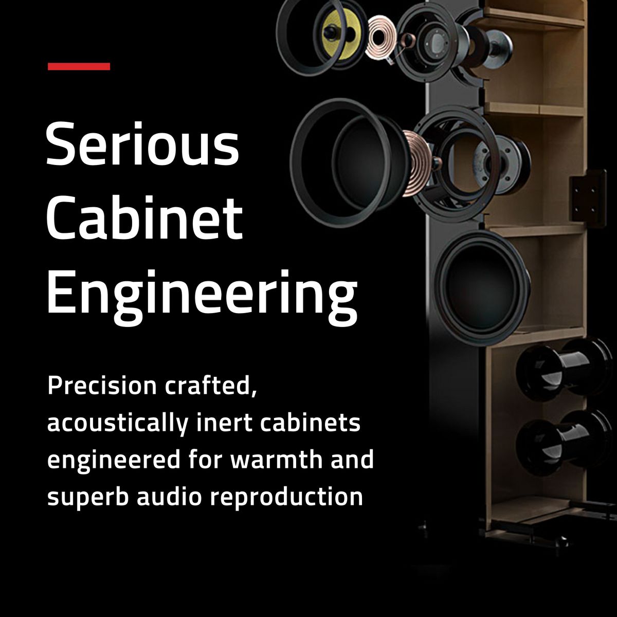 The cabinets are precision crafted with engineered wood to create a warm, distortion-free sound. The tapered cabinet design reduces standing waves eliminating unwanted cabinet resonance. The tower speakers' cabinet is composed of separate internal enclosures keeping sound waves isolated to eliminate acoustic interference. Outriggers with sound-isolation floor spikes eliminate floor reverberation.