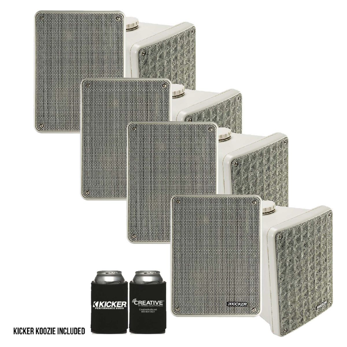 Kicker KB6 Indoor Outdoor Patio Speaker Bundle in Gray- 8 Speakers total- This bundle includes four (4) pairs of the Kicker 46KB6G Gray Indoor / Outdoor full-range, high-efficiency Speakers and a Kicker coozy. Kicker 46KB6G Gray KB6 Outdoor/Indoor full-range, high-efficiency Speakers - Pair. Rock that legendary KICKER sound inside, outside or out and about! Play the KB6 on your backyard deck, under the eaves, inside the shop, or near the pool for great sound, rain or shine. You can even go mobile! Use the universal bracket to mount the KB6 on your boat, off-road vehicle or RV. The KB6 is a full-range, high-efficiency speaker system truly suitable for indoor and outdoor use. Providing an 8-Ohm load and ready to be driven by your home stereo receiver or a car-audio amplifier, you can easily run a single pair or more with minimal effort (min. 18 AWG speaker wire required for easy-pinch terminals). The included bracketing makes it easy to install vertically or horizontally - on nearly any flat surface. Designed as a dual-enclosure weatherproof system, the KB6 features bold 6-1/2 -inch KICKER woofers and 2 x 5-inch, compression-loaded horn tweeters. The woofers utilize precisely tuned polypropylene cones and rugged Santoprene® surrounds. The system acoustically blends powerful bass and thrilling highs for an all-weather KICKER sound you’ll love to listen to all day long. Specifications - • Type: 2-way • Components per enclosure (in., cm): 6-1/2, 16.5 Woofer; 2x5, 5.1x12.7 tweet • Max Rec Amp Power (watts PEAK/RMS)*: 150/75 • Frequency Response (Hz): 55-21k • Standard Dimensions (in.): 11W x 8-1/8H x 8-1/8D • Metric Dimensions (cm.): 27.9W x 20.7H x 20.7D • Impedance (ohms): 8 • Sensitivity (dB 1w/1m): 90 • Grilles: Yes
