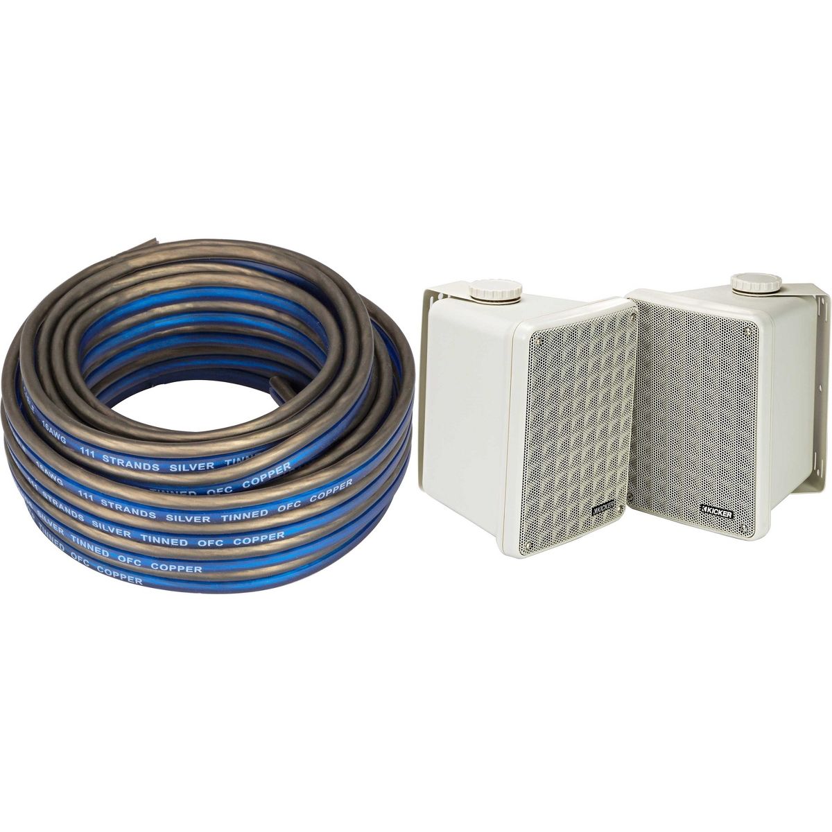 Complementing the speakers is the Kicker 46KW1620 K-Series 16AWG Speaker Wire. This 20-foot spool of 16 Gauge wire features square Frost Blue wire for positive terminals and Frost Clear for easy identification during installation. Both cables are silver-tinned and oxygen-free, ensuring excellent signal transfer and sonic accuracy. Perfect for connecting your speakers to powerful amps, this quality wire enhances your audio setup. Upgrade your sound system with this versatile bundle for immersive audio enjoyment in any environment.