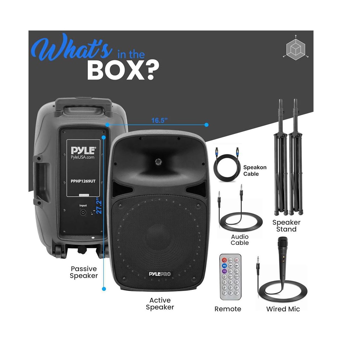 Designed for portability and durability, the PPHP1569UT includes integrated carry handles and is compatible with 35mm speaker stands. Its rugged construction ensures reliable performance indoors and outdoors.