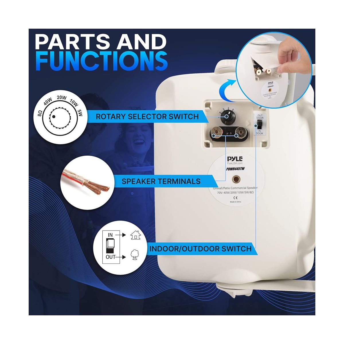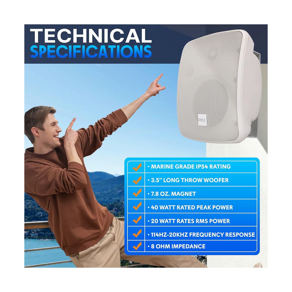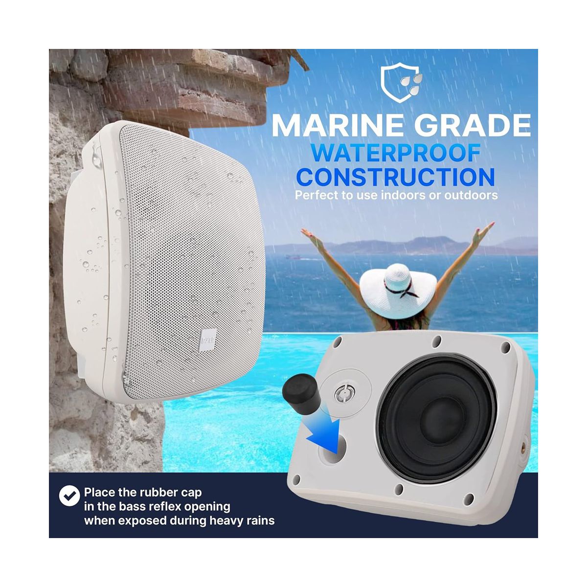 The Pyle PDWR445TW 4" Waterproof On-Wall/Patio Commercial Speaker is perfect for both indoor and outdoor environments. With its marine-grade waterproof construction and IP54 rating, this speaker is built to withstand the elements. It features a 2-way full range stereo sound system, providing high power and deep bass response. The speaker grills are rust-proof, and the gold-plated plug terminals ensure optimal connectivity. The heavy-duty plastic composite cabinet and adjustable mounting bracket make installation easy. Ideal for use by the pool, on the patio, or for public address systems, this speaker offers versatile and reliable audio performance.