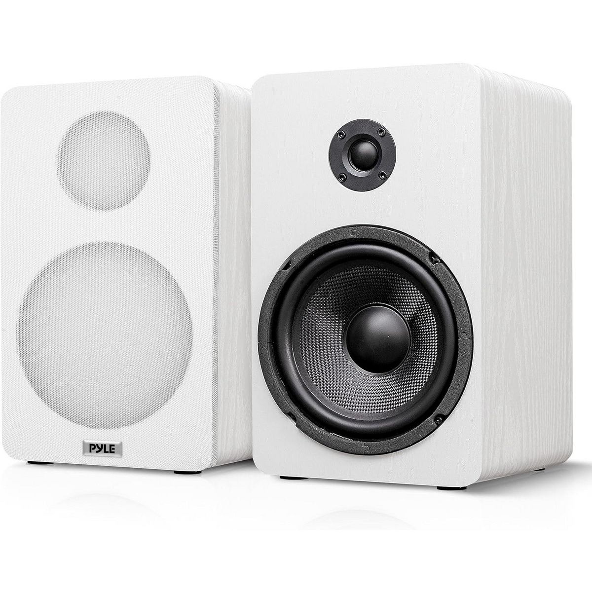 Pyle 6.5" Home Theater Wooden Bookshelf Speakers - 2 Way HiFi Sound with Built-in Wall Mount Bracket for Easy Installation (Pair) (White)
