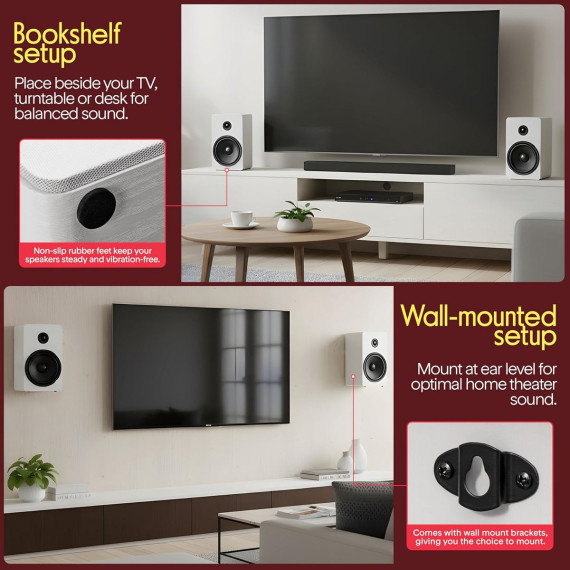 The Pyle 6.5" Home Theater Wooden Bookshelf Speakers offer high-quality sound with a sleek, modern design. Featuring a 6.5" woven glass fiber woofer and a 0.75" silk dome tweeter, these 2-way HiFi speakers provide crisp highs and deep, resonant lows. The white wood finish adds a touch of elegance, and the built-in wall mount bracket ensures easy installation. These speakers are perfect for a variety of audio setups, delivering big sound in a compact design ideal for home theaters, bookshelves, or music rooms.