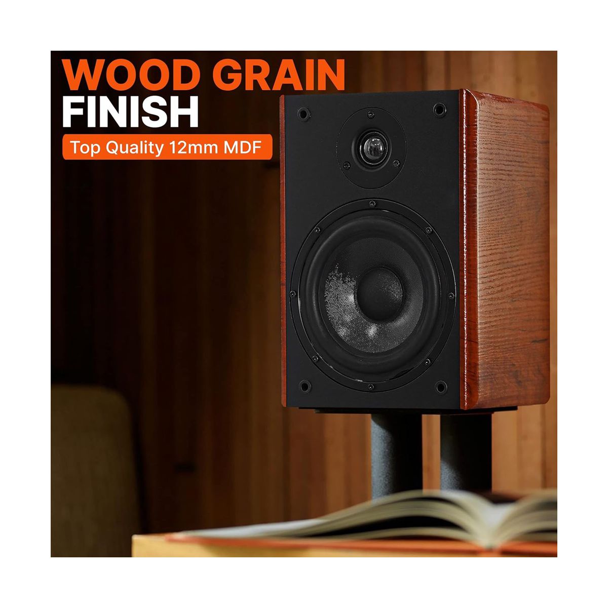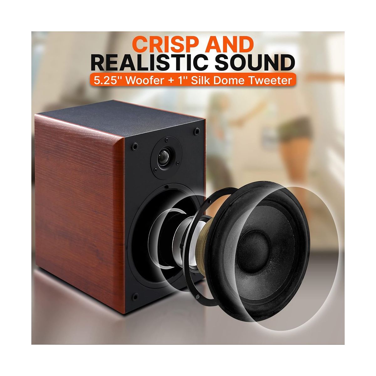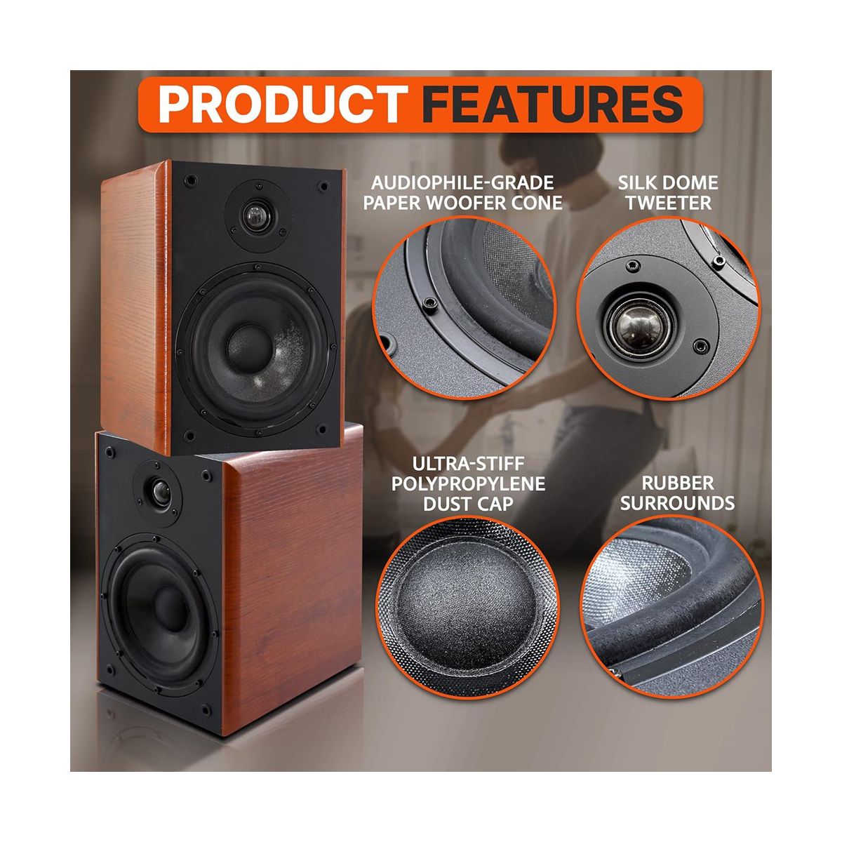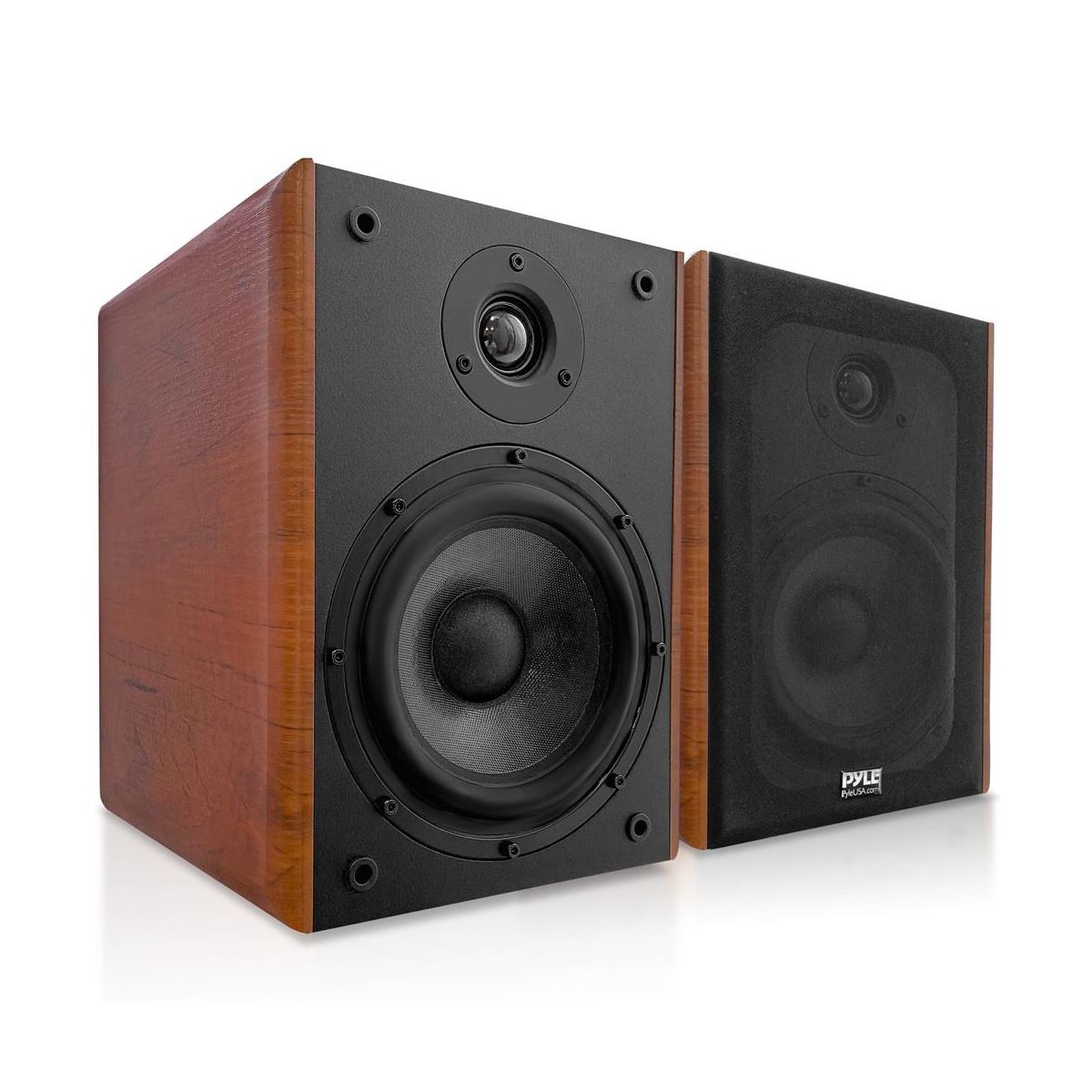 The Pyle PHQBS52 5.25" Home Theater Bookshelf Speakers deliver an audiophile-grade sound experience. Featuring a black painted paper woofer cone and a silk dome tweeter, these speakers offer both deep bass and crisp high-frequency sound. The speakers are constructed with top-quality MDF and finished in a beautiful wood grain design, perfect for any home theater setup. With gold-plated 5-way binding post terminals, they offer versatile connectivity options. These bookshelf speakers are an excellent addition to any audio setup, providing powerful, immersive sound.