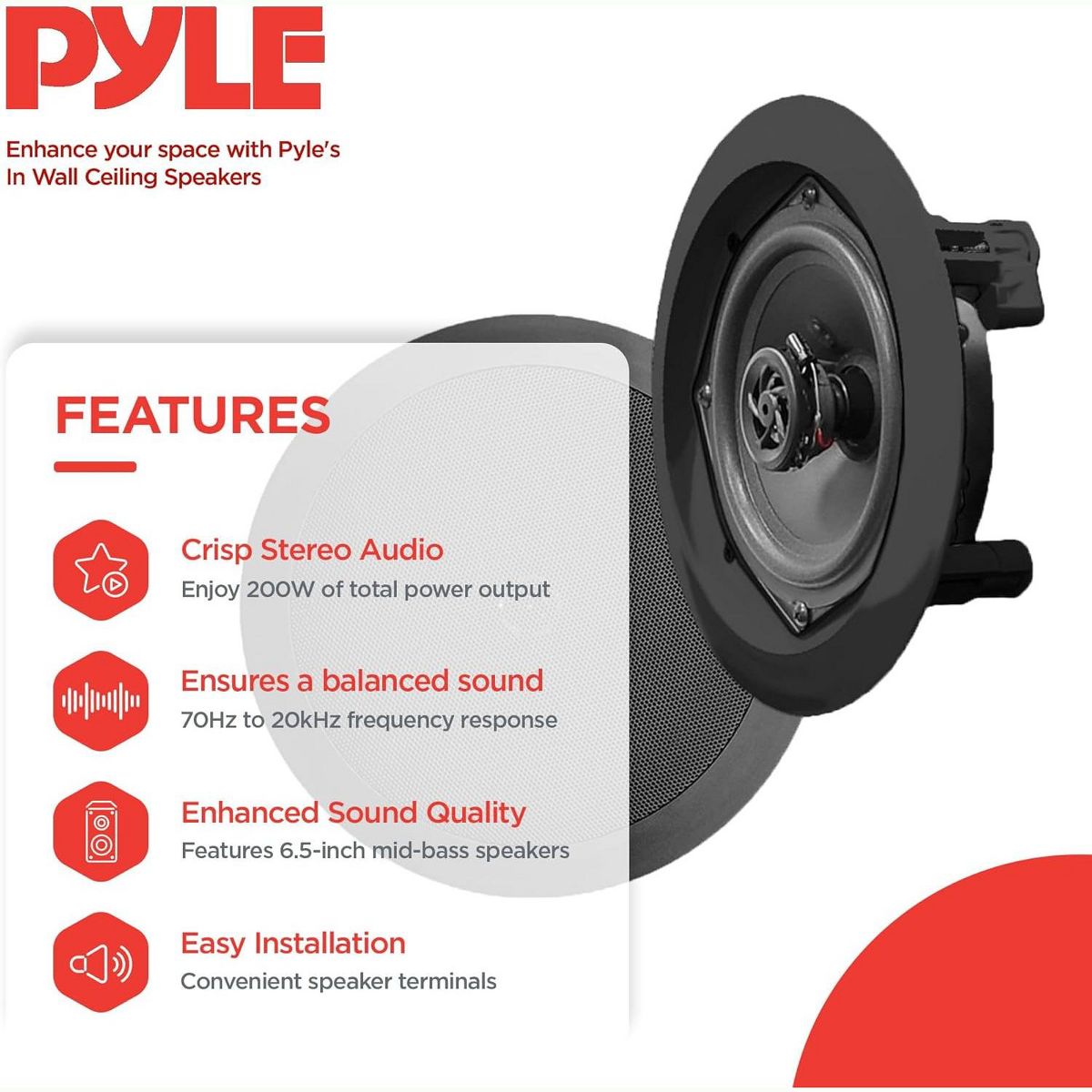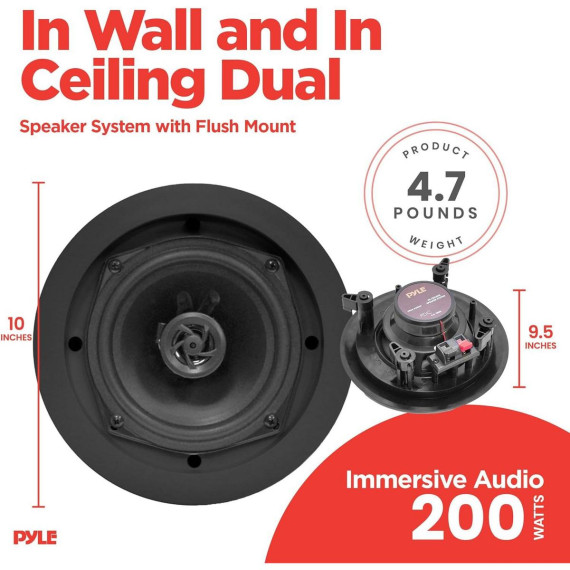 The Pyle PDIC61RDBK is a pair of 6.5'' in-wall/in-ceiling speakers designed to provide powerful stereo sound while saving space. These 2-way speakers feature a 6.5'' midbass speaker and a directable 1/2'' polymer dome tweeter for clear, full-range audio. The flush-mounting design ensures a clean, modern look, while the resilient ABS plastic construction ensures durability. With wide frequency response, dog-ear brackets, and easy-to-use wire terminals, these speakers are perfect for custom audio installations.