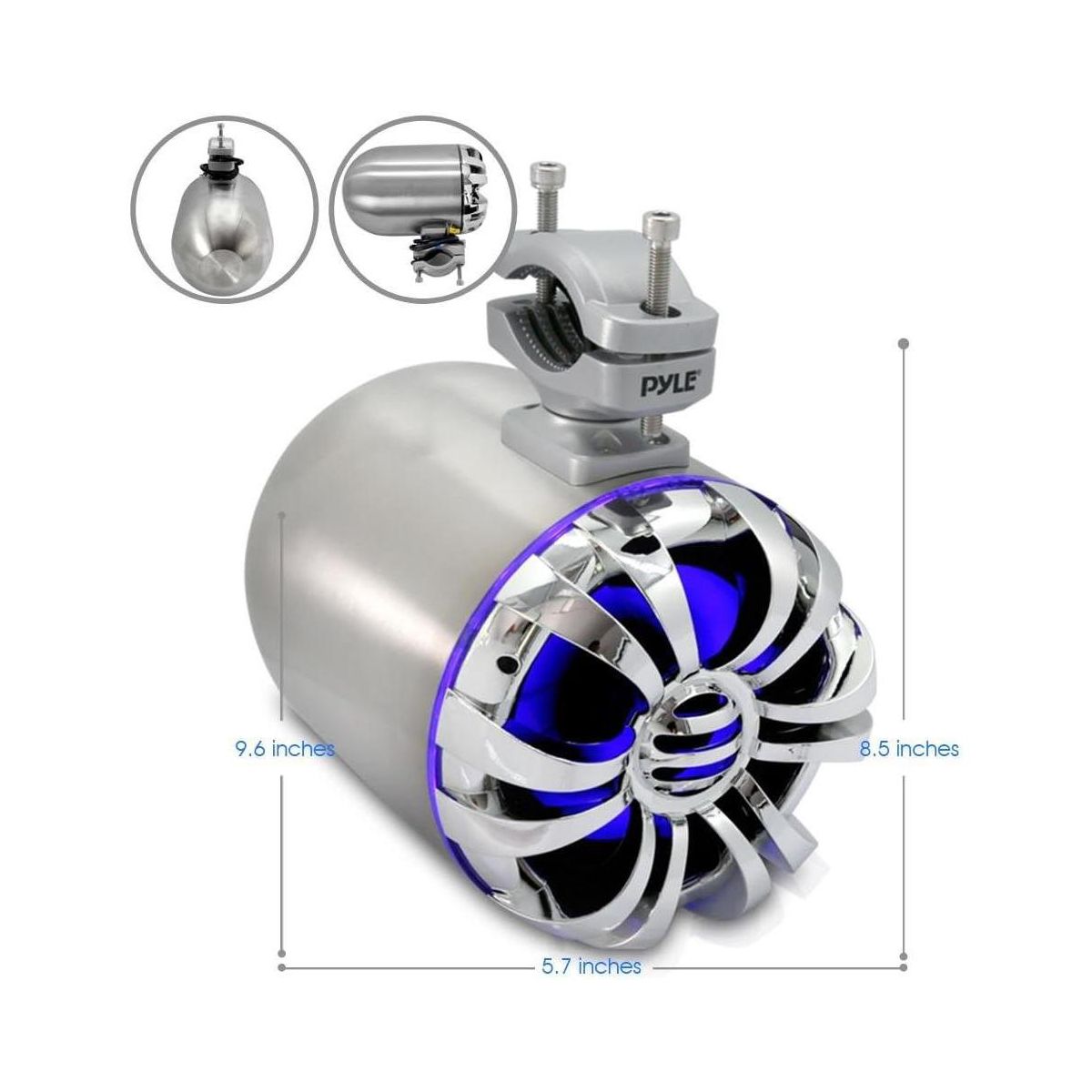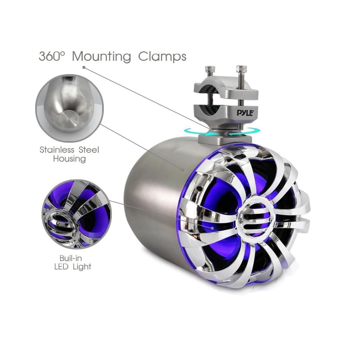 The Pyle PLMRWB50L Waterproof Marine Wakeboard Tower Speakers are the perfect addition to your boat or outdoor adventure. With a rugged stainless steel housing and engineered ABS speaker grills, these 5.25" subwoofers and 1" titanium dome tweeters deliver full-range, high-quality sound that’s perfect for any outdoor or marine environment. The built-in blue LED lights add a striking visual element to your setup, illuminating the atmosphere. Designed for easy installation, these speakers come with universal roll bar mounting clamps that allow 360° positioning. They are waterproof (IP-44 rated), weather-resistant, and UV resistant, ensuring they withstand the elements. Whether you're out on the water or enjoying a party in the yard, these speakers provide excellent sound and reliable performance.