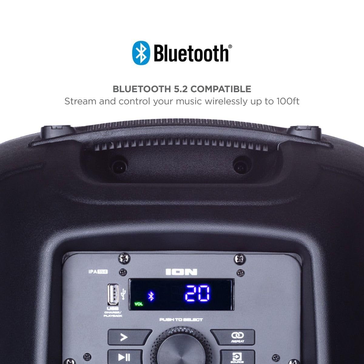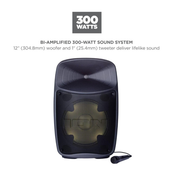 The ION Audio Pro Glow Ultra is a high-power 300-watt bi-amplified PA system with lights and Sonic Wide Audio which provides premium sound to the front, left, and right of the speaker.