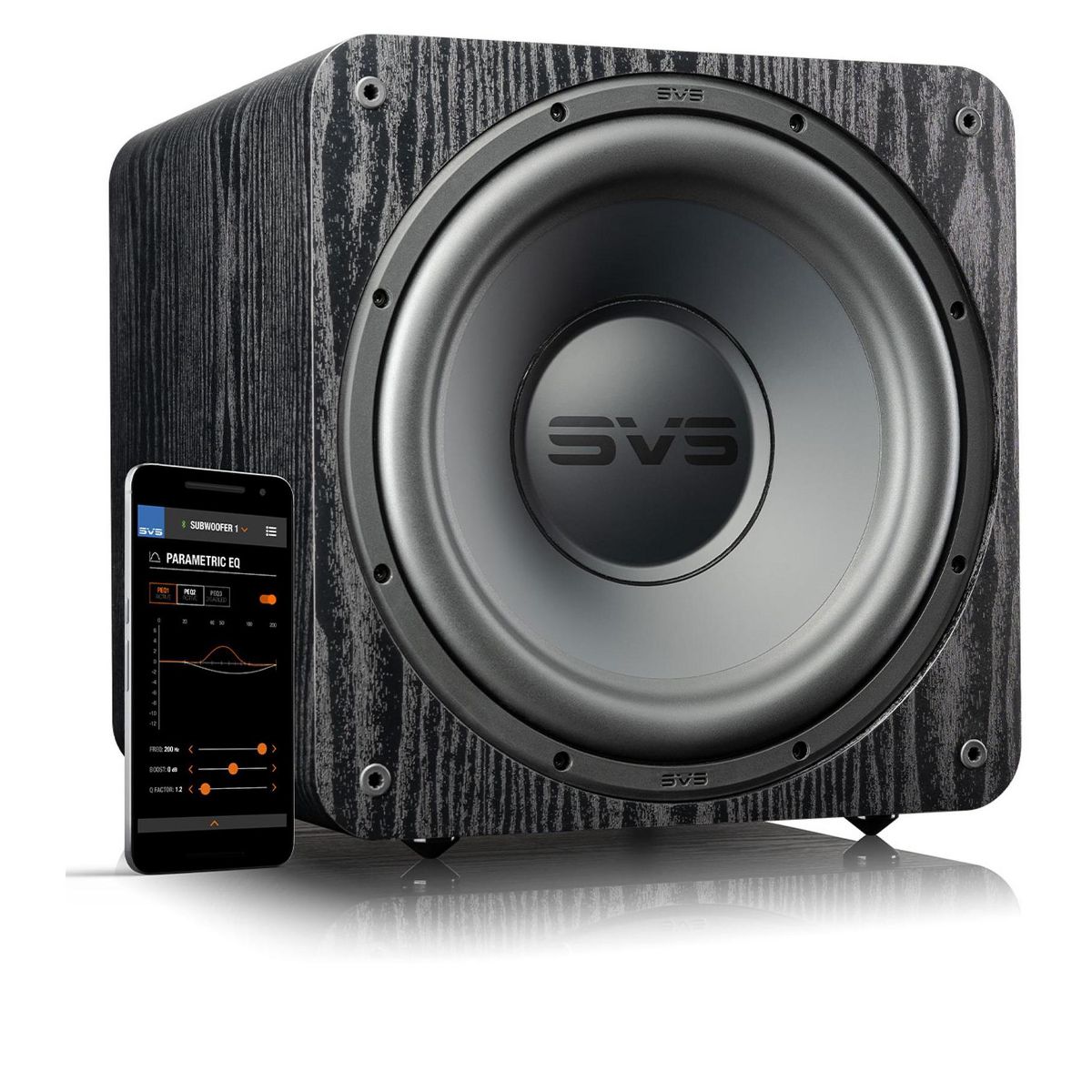 Featuring an all-new 12-inch high-excursion driver and reference amplifier technology used in flagship SVS subwoofers SB-1000 Pro is a well-balanced powerhouse with a legendary performance pedigree. 325 watts RMS 820+ watts peak power Sledge amplifier with fully discrete MOSFET output and sophisticated 50 MHz DSP load a room with chest-thumping and accurate bass you can feel that belies its compact cabinet. Also features the SVS subwoofer DSP smartphone app for advanced tuning and control.