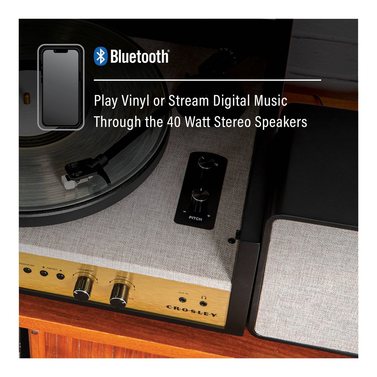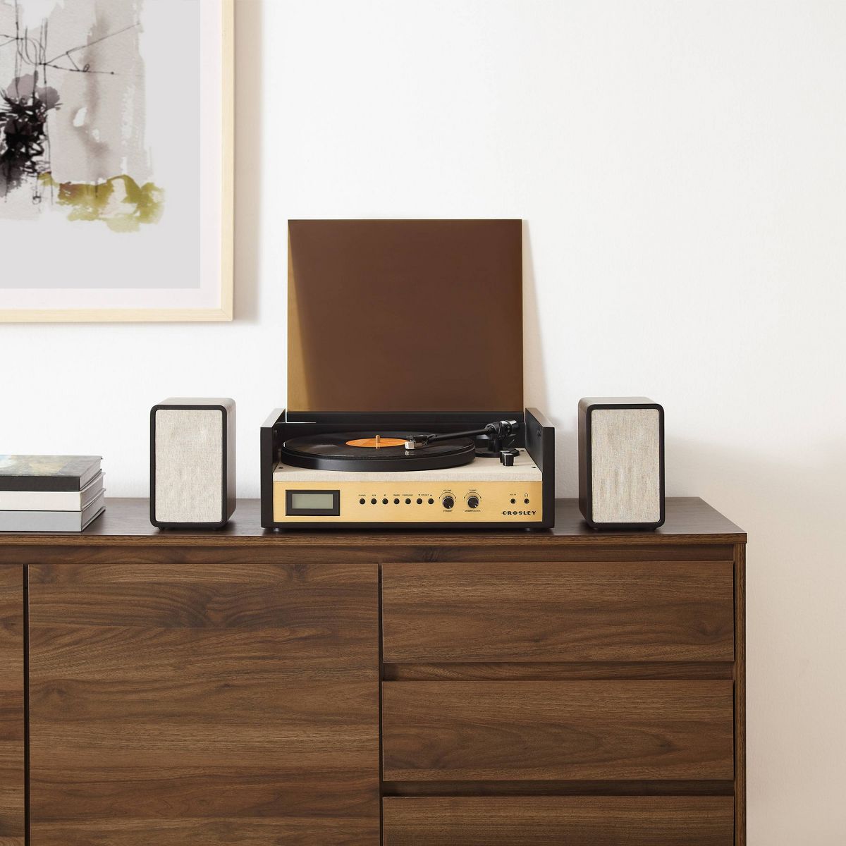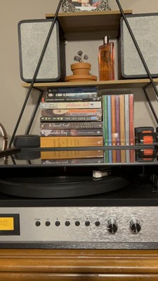 Give your record collection a level up in technical sophistication with the Coda Shelf System. This sleek system was designed with high-end, modern interiors serving as inspiration. Pick out your favorite record, choose between three speeds (33 1/3, 45, & 78 RPM), drop the fully manual tone arm with mounted moving magnetic cartridge onto your vinyl, and start listening to music the way the artist intended through matching stereo speakers. When you're not spinning vinyl on this Instagram-worthy set-up, lower the dust cover and keep it clean while looking chic. Want a break from analog? Connect to the built-in Bluetooth receiver and stream your favorite playlist or switch over to the AM/FM radio to tune in to your local public station. 27.5”W x 13.5”D x 7.75”H