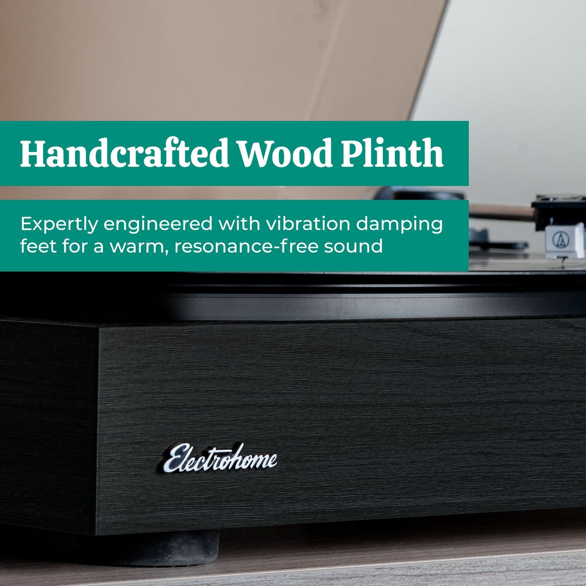The retro handcrafted wood cabinet is designed to minimize environmental vibrations for a warm, resonance-free sound with vibration damping rubber feet for further isolation from the surface.